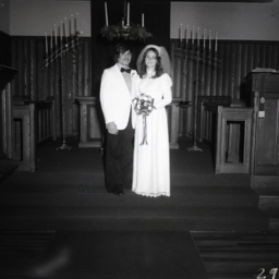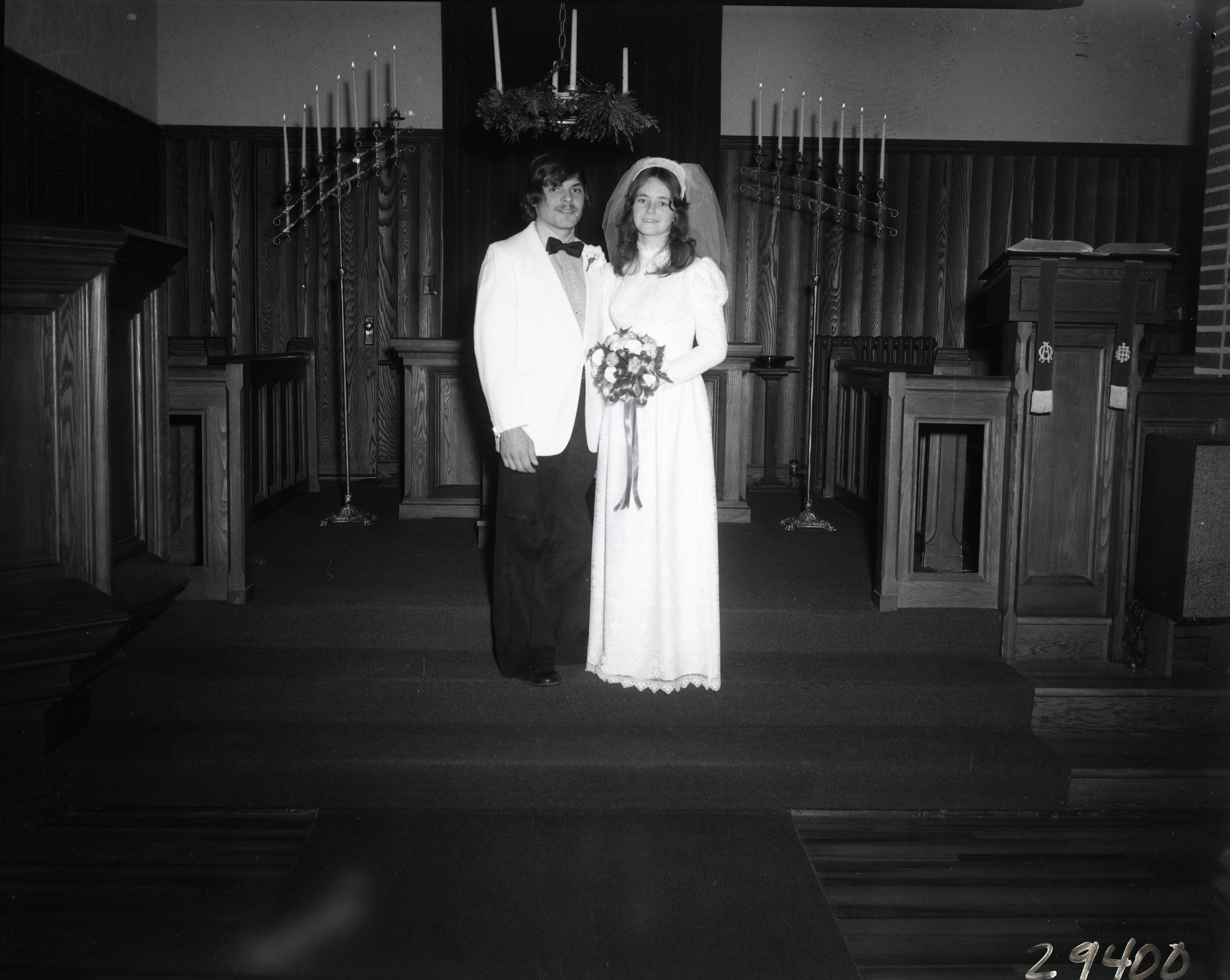 Unidentified bride and groom in their wedding attire standing together on the altar of a church.
