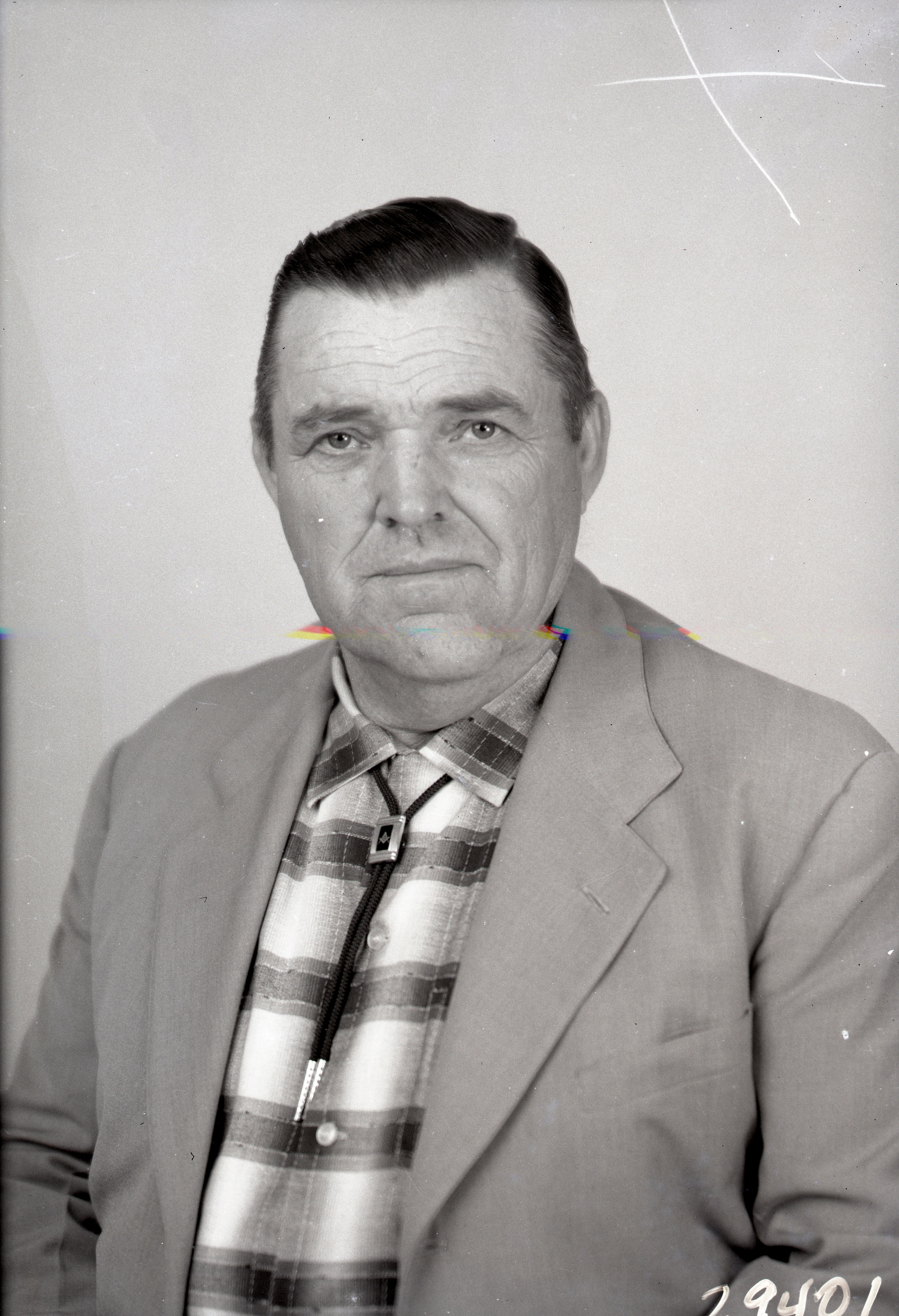 Portrait photograph of an unidentified man wearing a plaid shirt, bolo tie, and jacket.