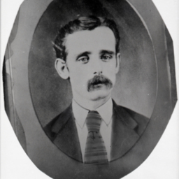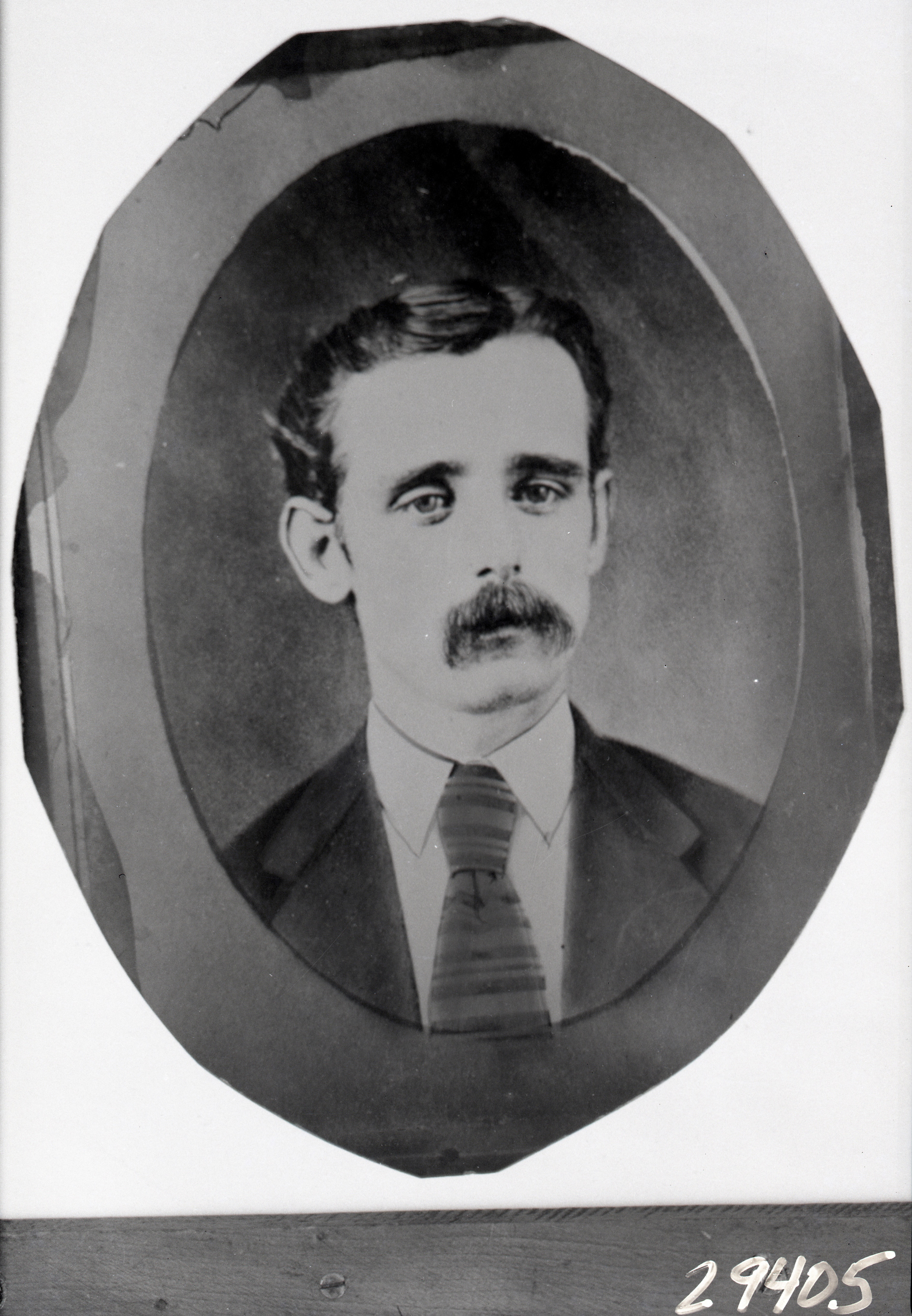 Photo of an oval-framed portrait photograph of an unidentified young man with a mustache and wearing a suit and tie.
