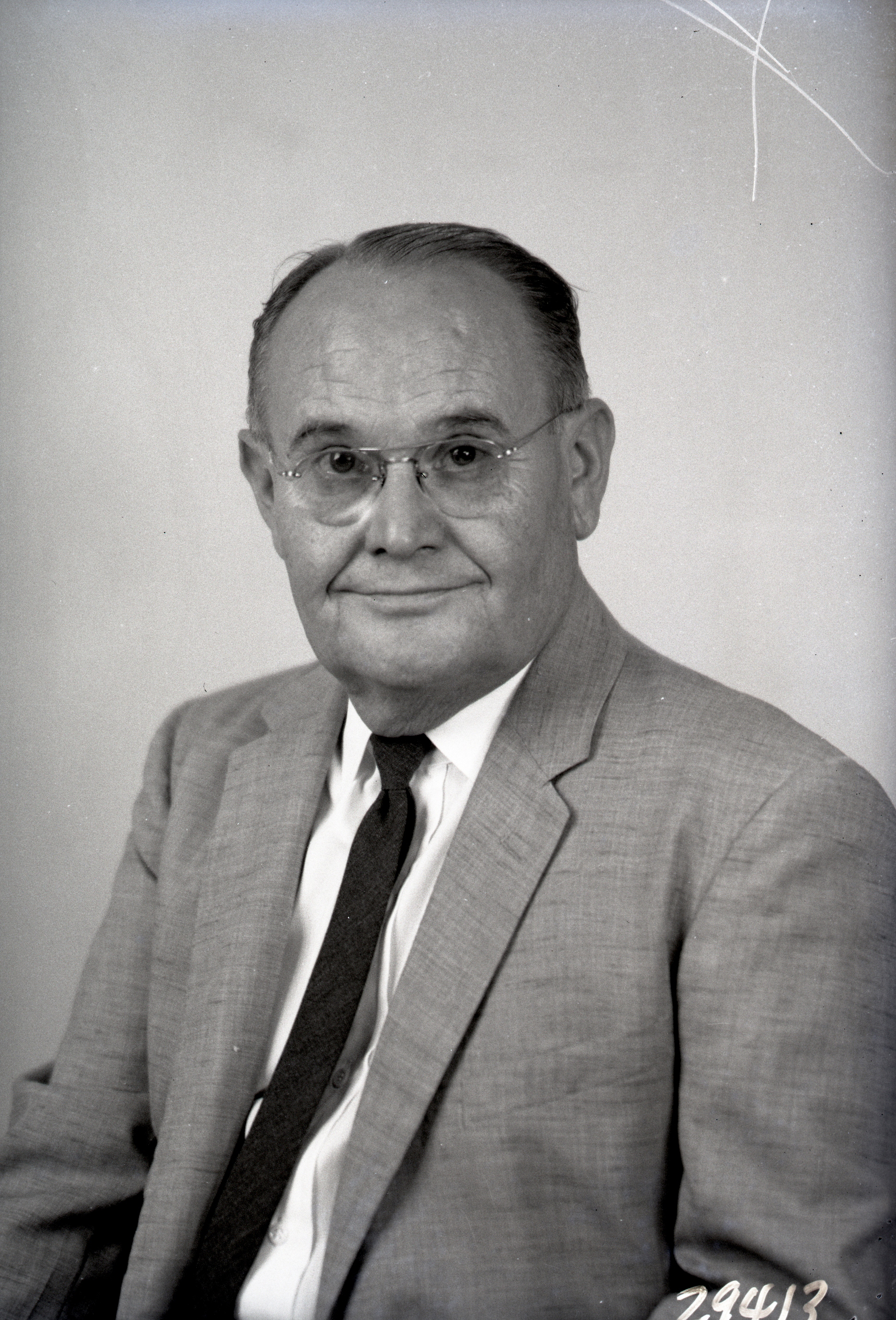 Portrait photograph of an unidentified man with glasses and wearing a suit and tie.