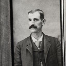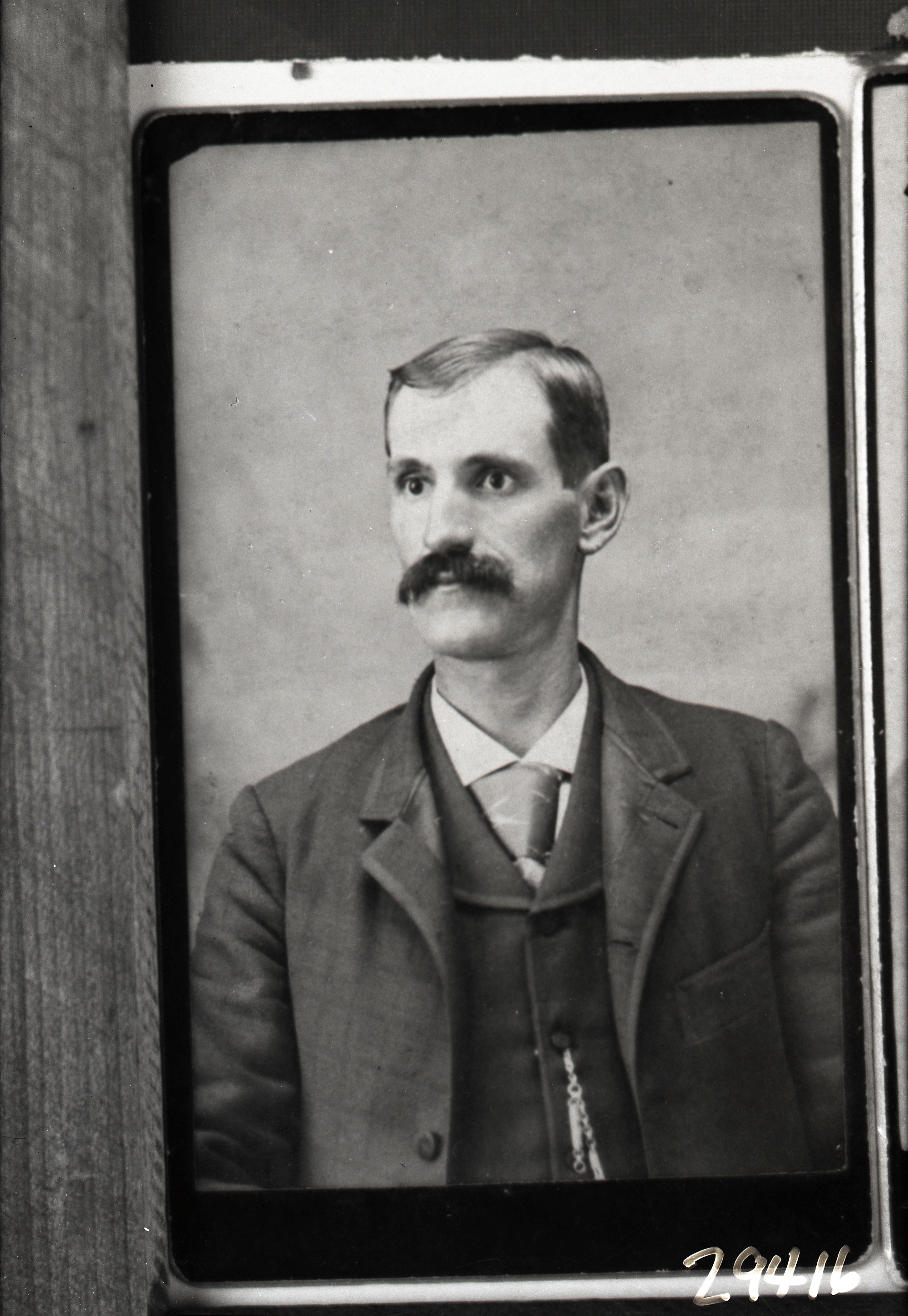 Photo of a portrait photograph of an unidentified man with a mustache and wearing a suit and tie.