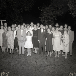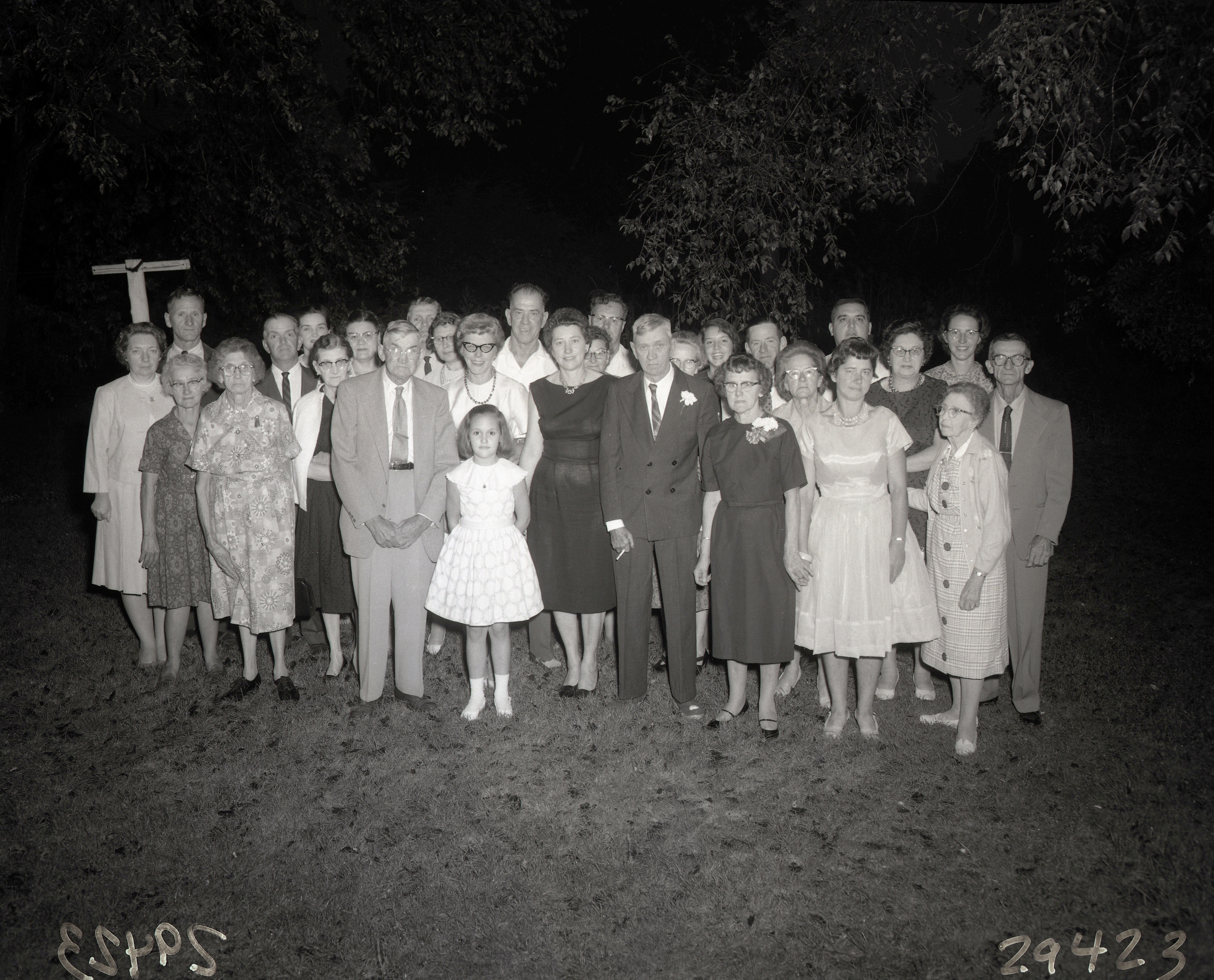 Large group of unidentified men, women, and children standing together outdoors at night.