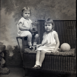 Two unidentified young girls, both with bangs, are posed together on a wicker bench.