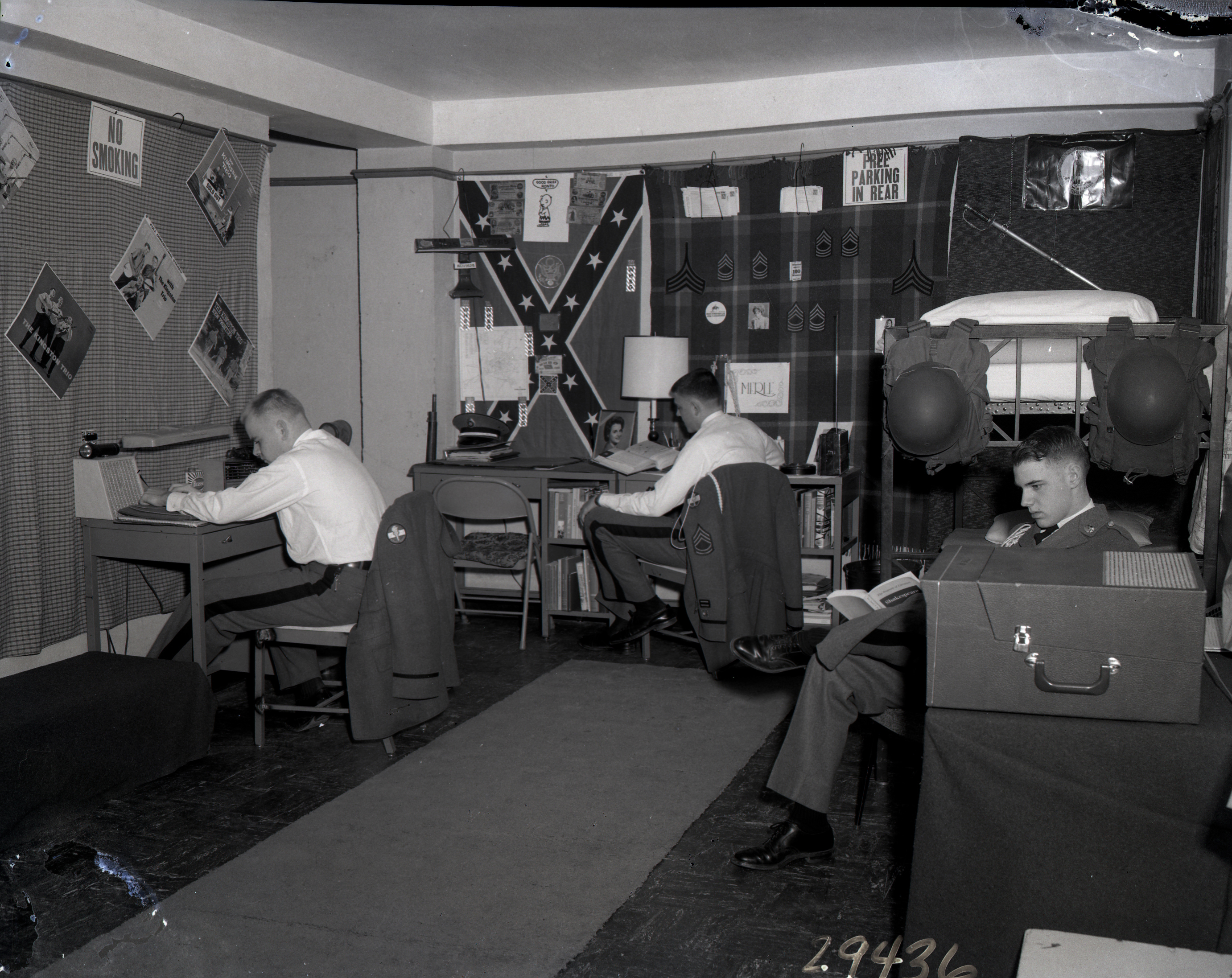 Three unidentified cadets from Massanutten Military Academy (MMA) are shown in their dormitory room.