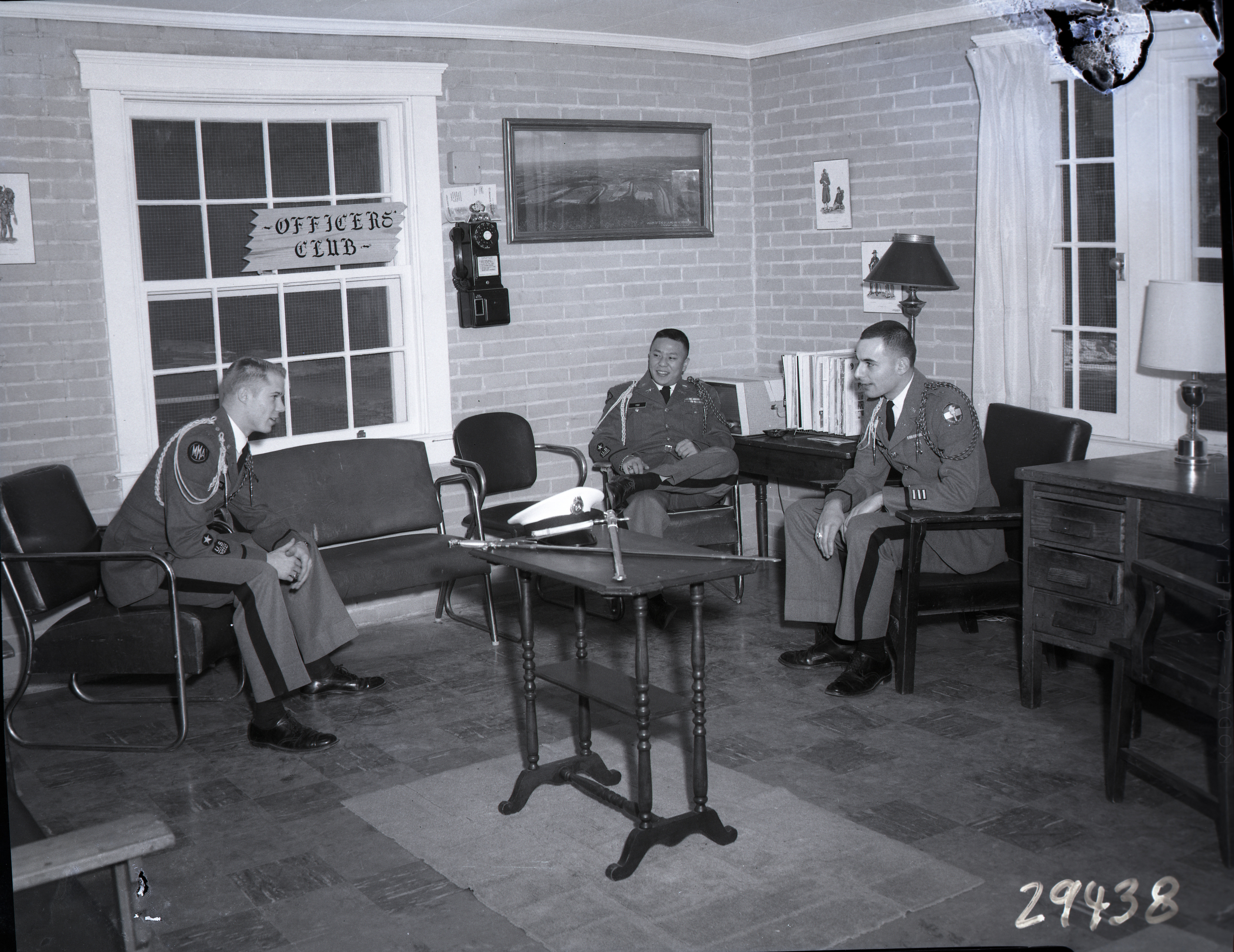 Three unidentified cadets from Massanutten Military Academy (MMA) are posed seated in a room.