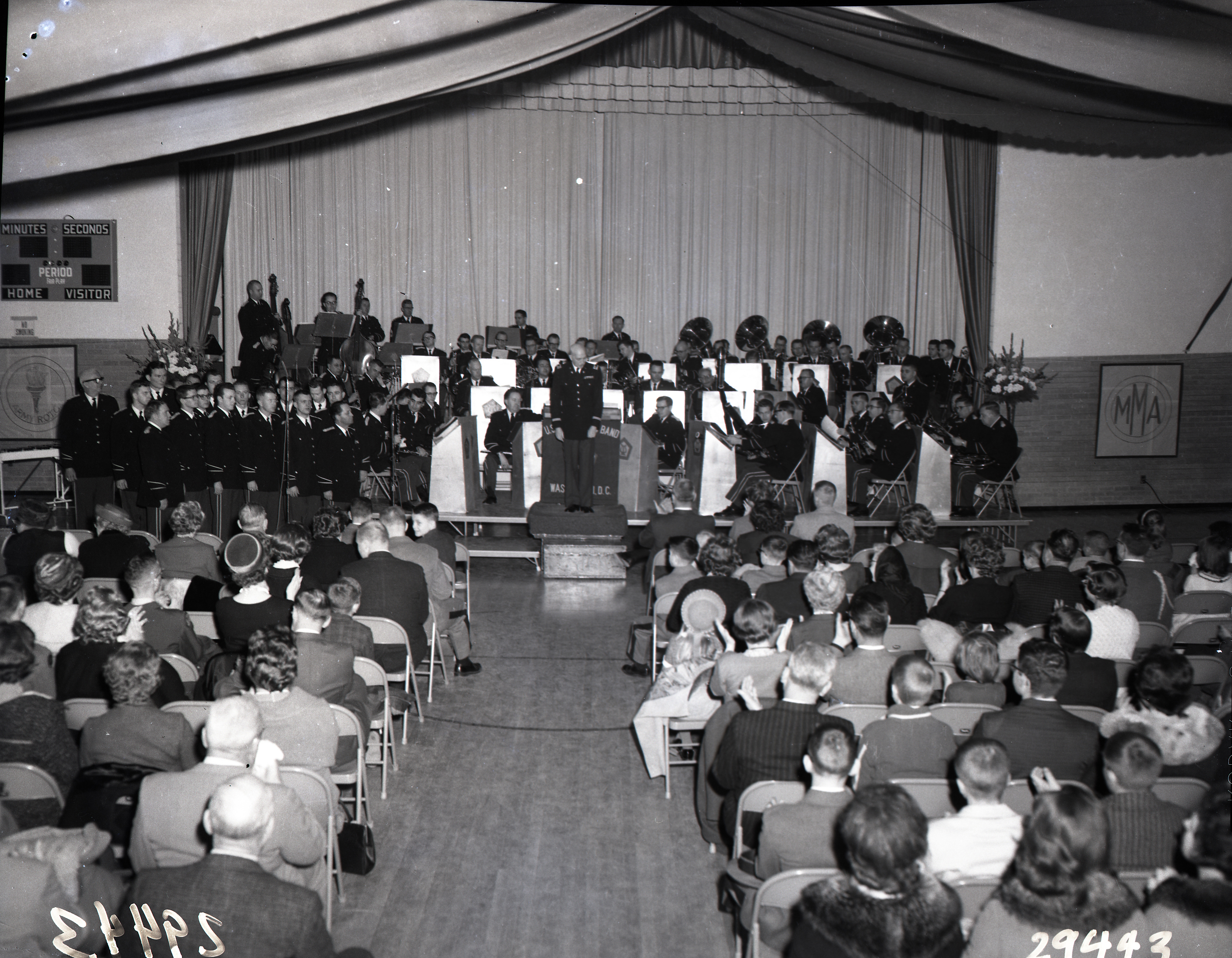 Photograph of the U.S. Army Band from Washington D.C. performing in the gymnasium of Massanutten Military Academy (MMA).