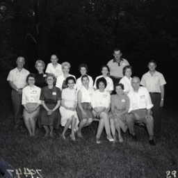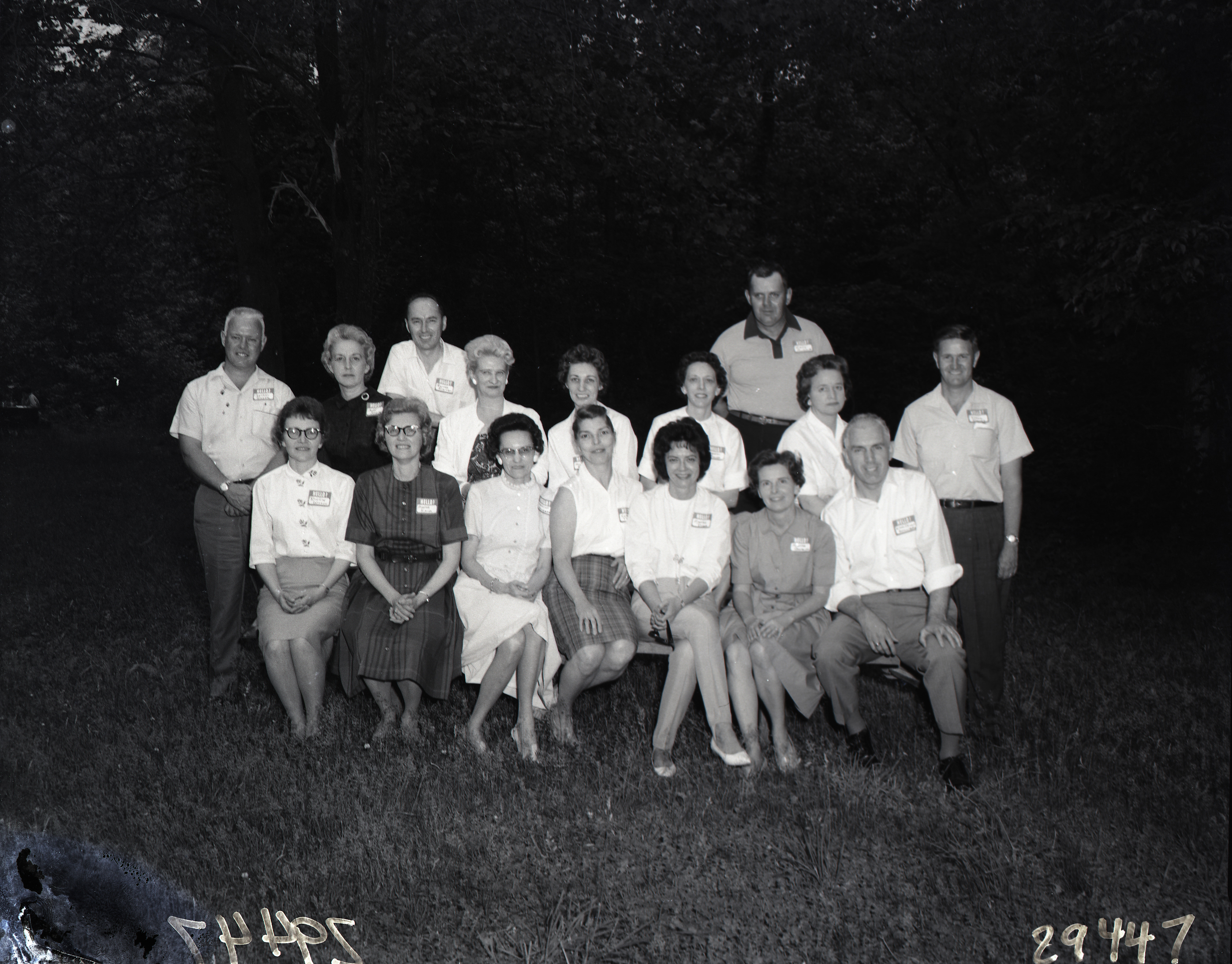 Sixteen unidentified people, eleven women and five men are posed together, all wearing name tags.