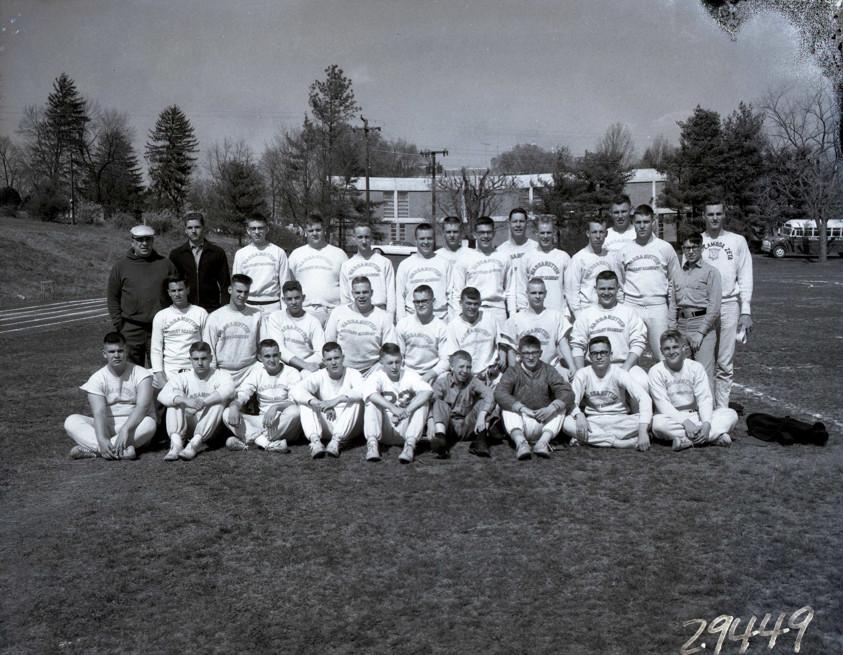Photograph showing a group of unidentified Massanutten Military (MMA) cadets at Gordon Bowman Stadium in Woodstock Virginia.