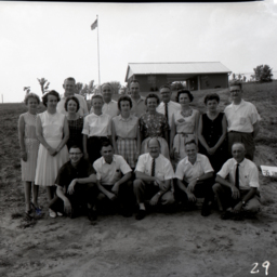Unidentified members of a high school class or something similar are posed together outdoors in Woodstock.