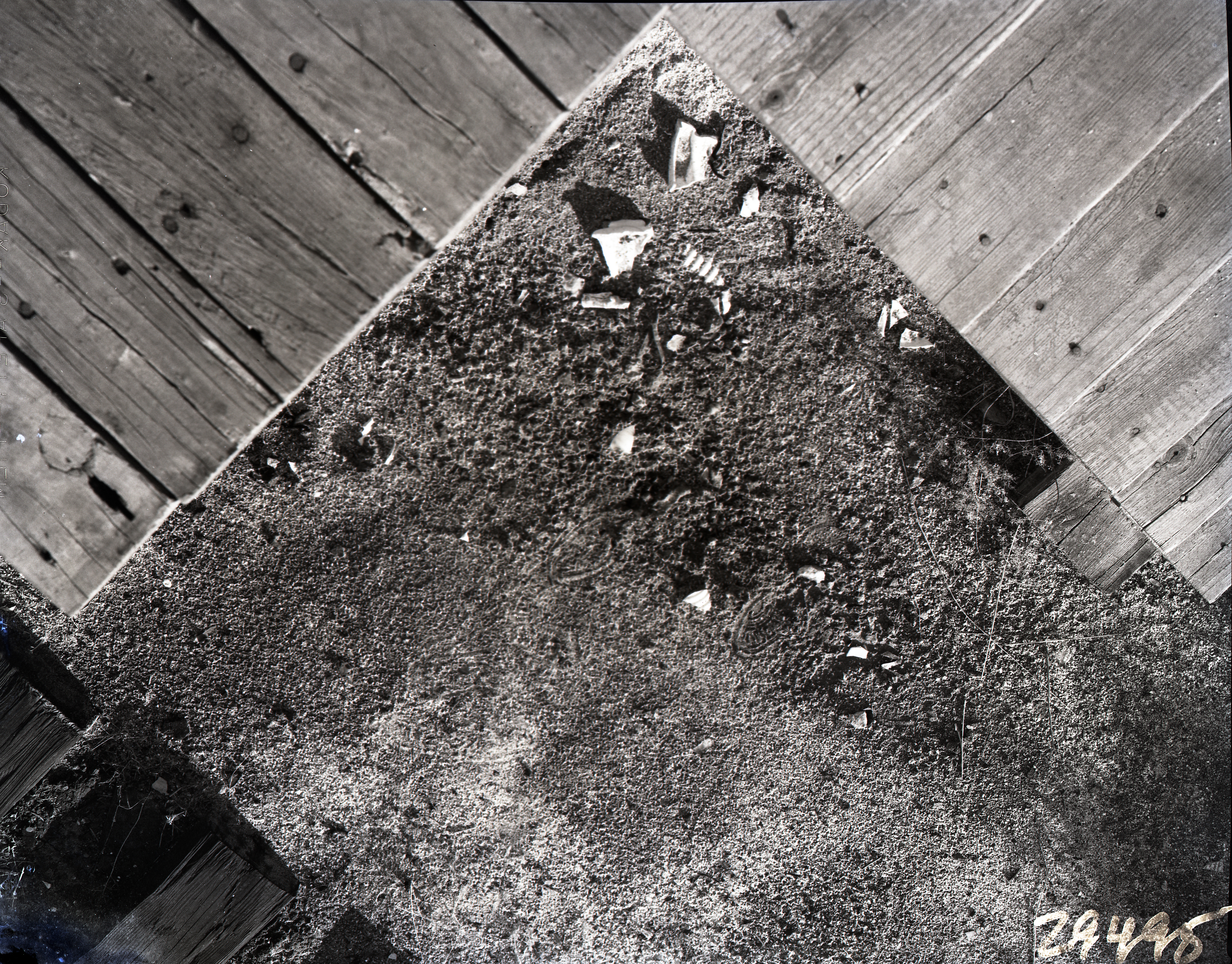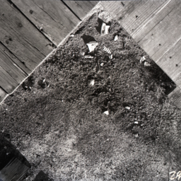 Photograph of what appears to be a corner of a wooden walkway made of planks with the ground and other items visible as well.