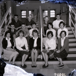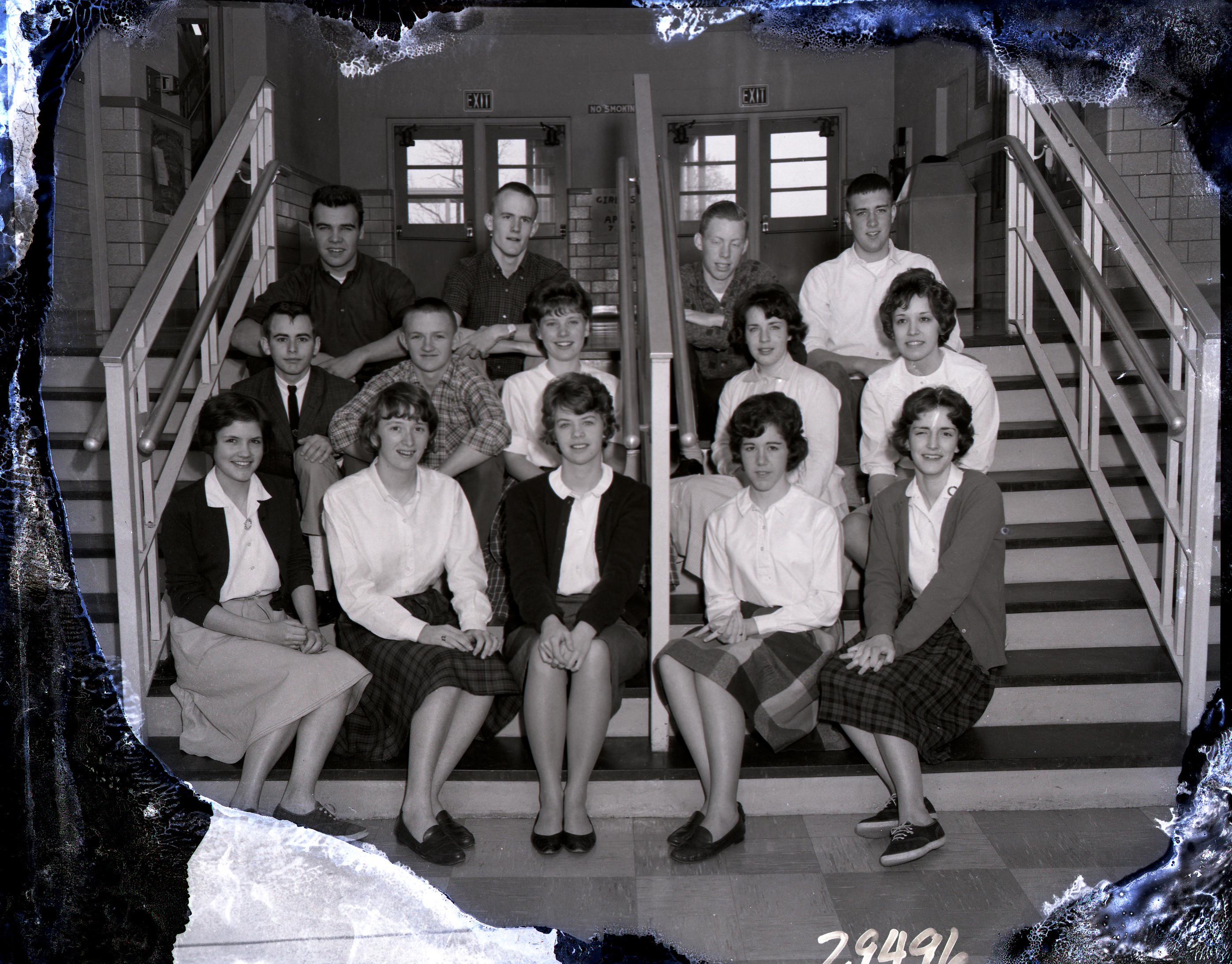 Group of unidentified young men and women students seated together on interior steps of their school.
