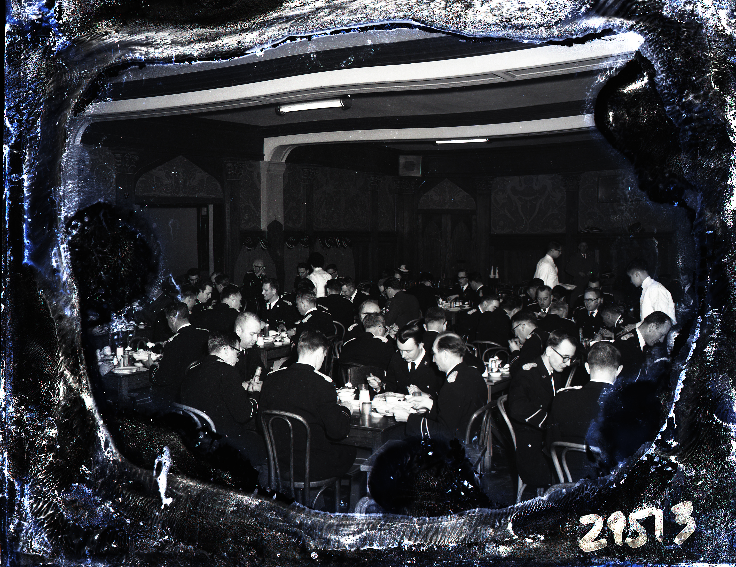 Photograph of unidentified men in uniforms having a meal together in the dining room of Massanutten Military Academy (MMA).