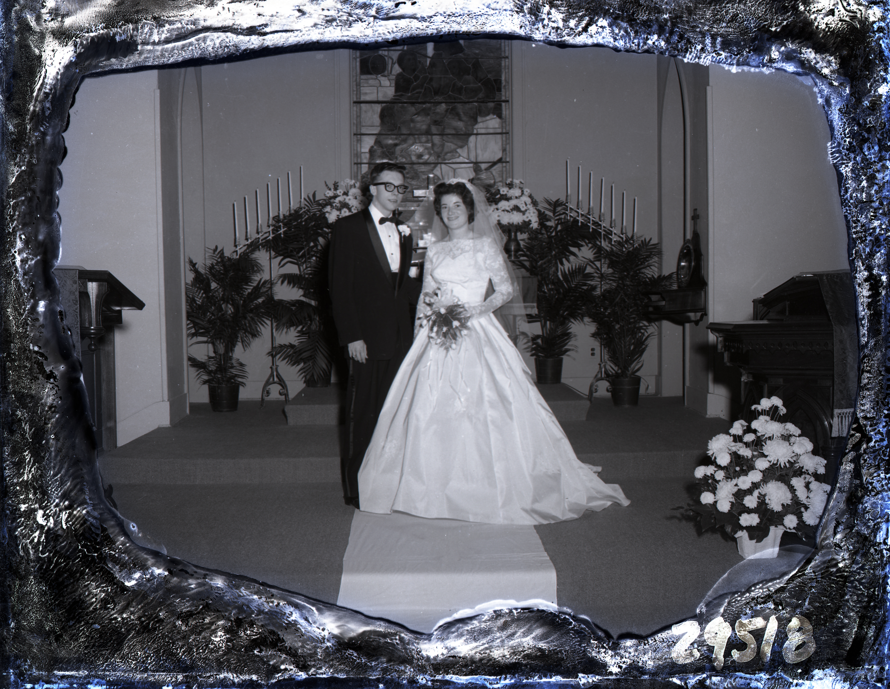 Photograph of Robert "Bob" Grant and his new bride, Elizabeth Ann "Sue" (Hollingsworth) Grant, standing together in Emanuel Lutheran Church in Woodstock on their wedding day.