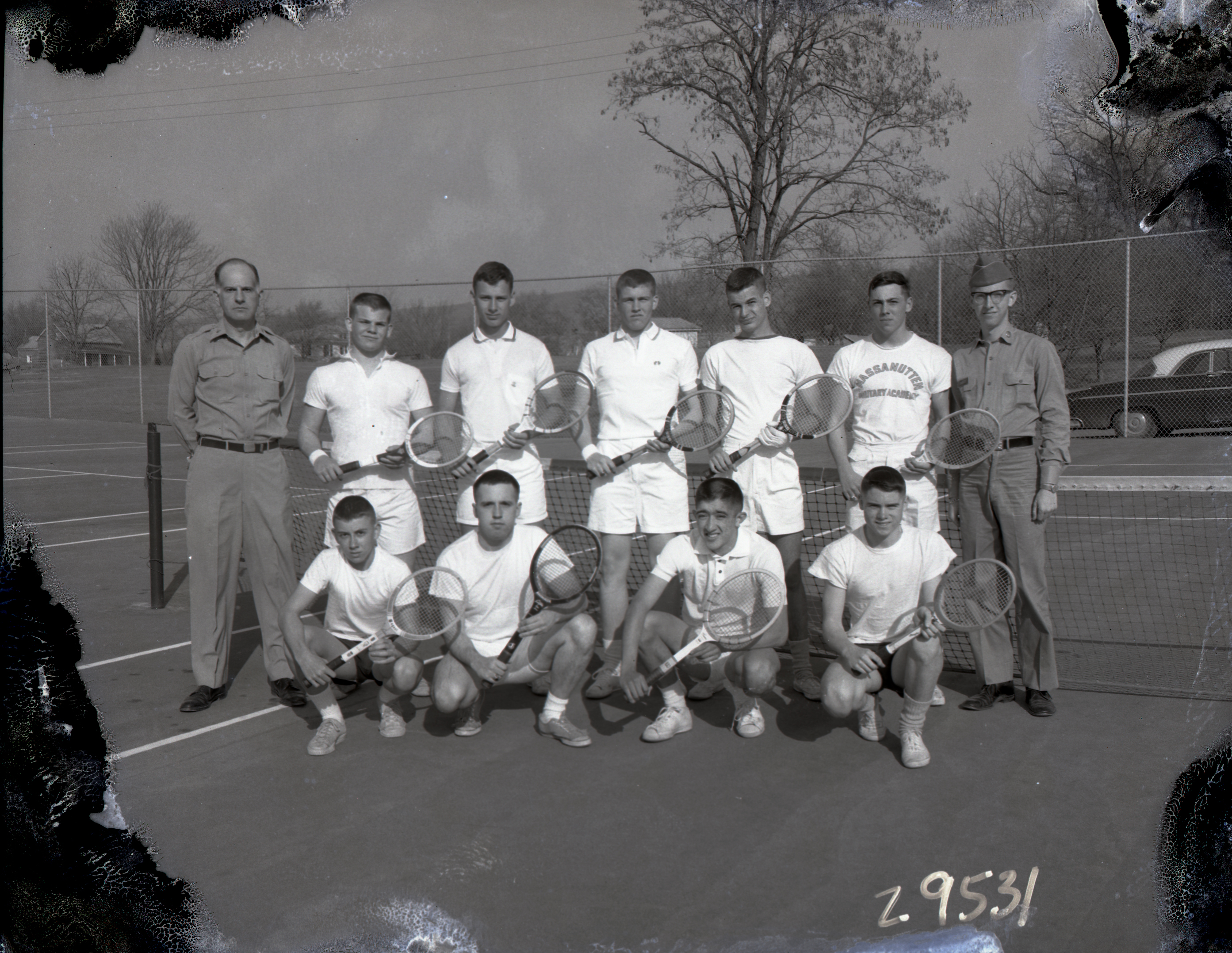 Unidentified members of the Massanutten Military Academy (MMA) tennis team standing with their racquets on the tennis court.