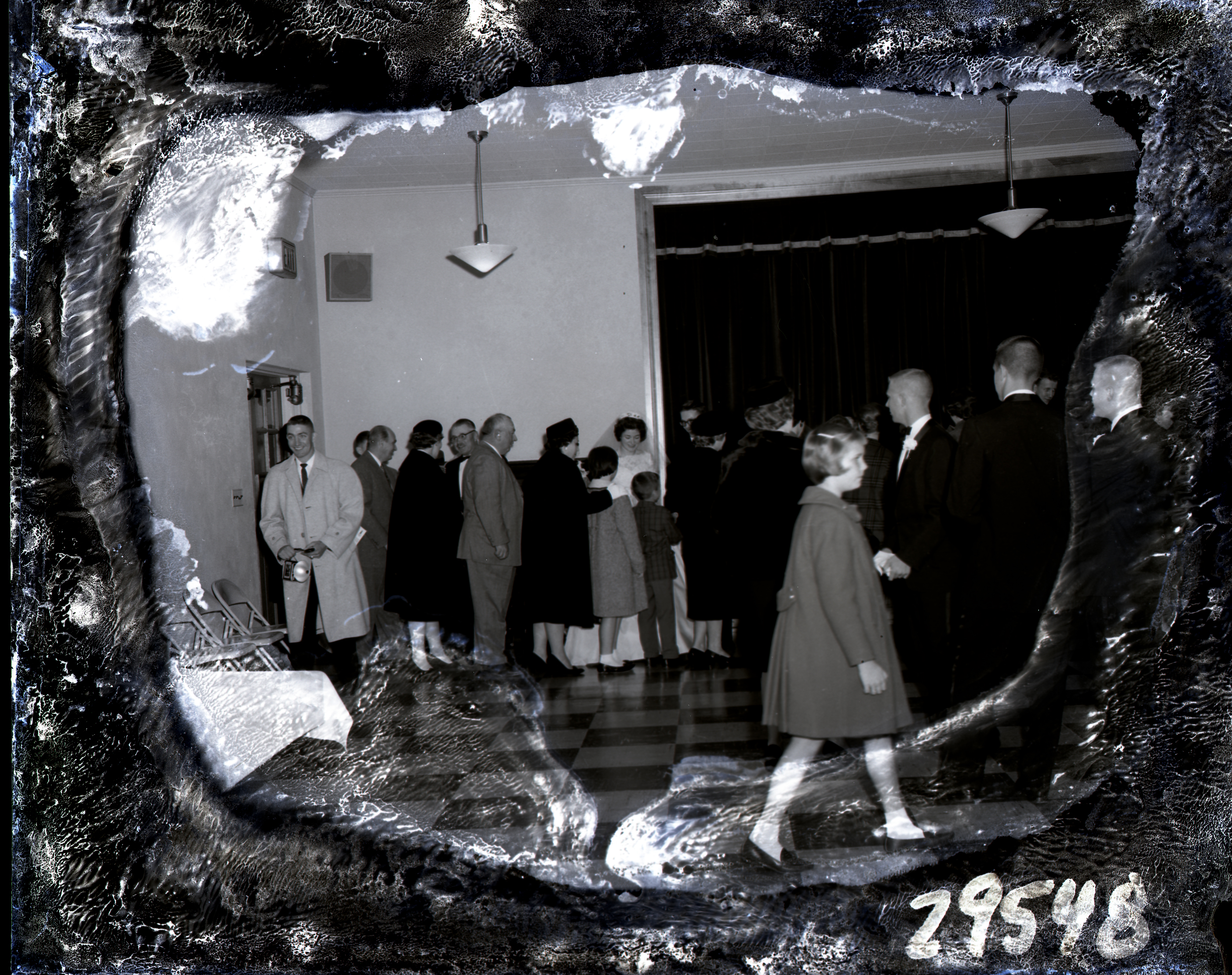Photograph of guests going through the reception line at the wedding of Bob and Sue (Hollingsworth) Grant held at Emanuel Lutheran Church in Woodstock in 1962.