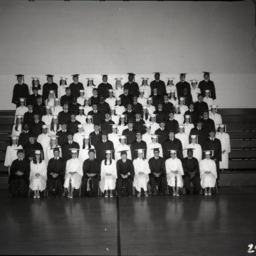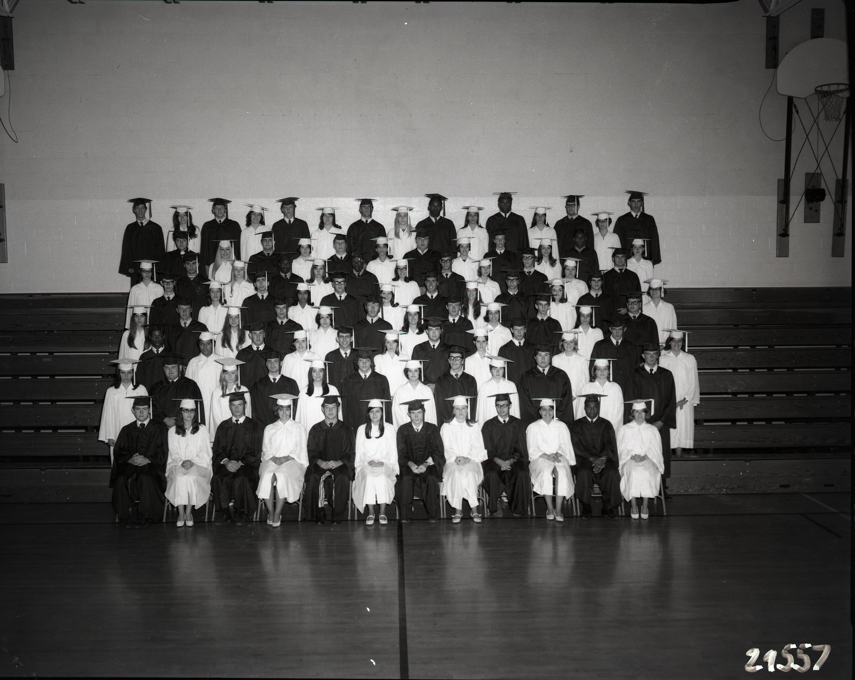 Group of unidentified high school seniors posed together in their graduation caps and gowns on the bleachers of their school's gymnasium.
