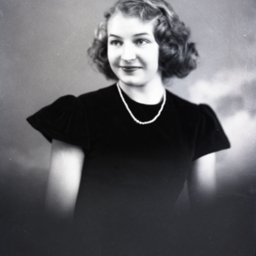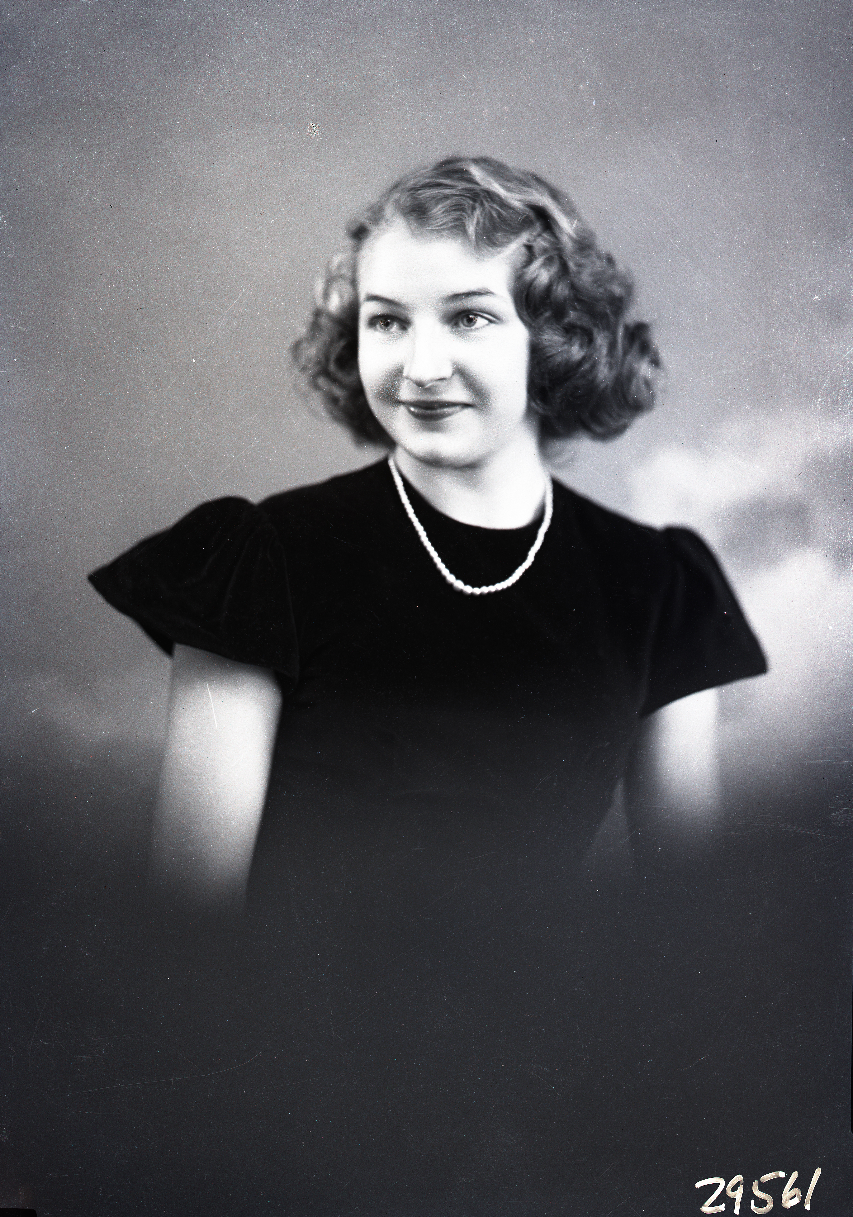 Portrait photograph of an unidentified woman with short curly hair and wearing faux pearls with her dress.