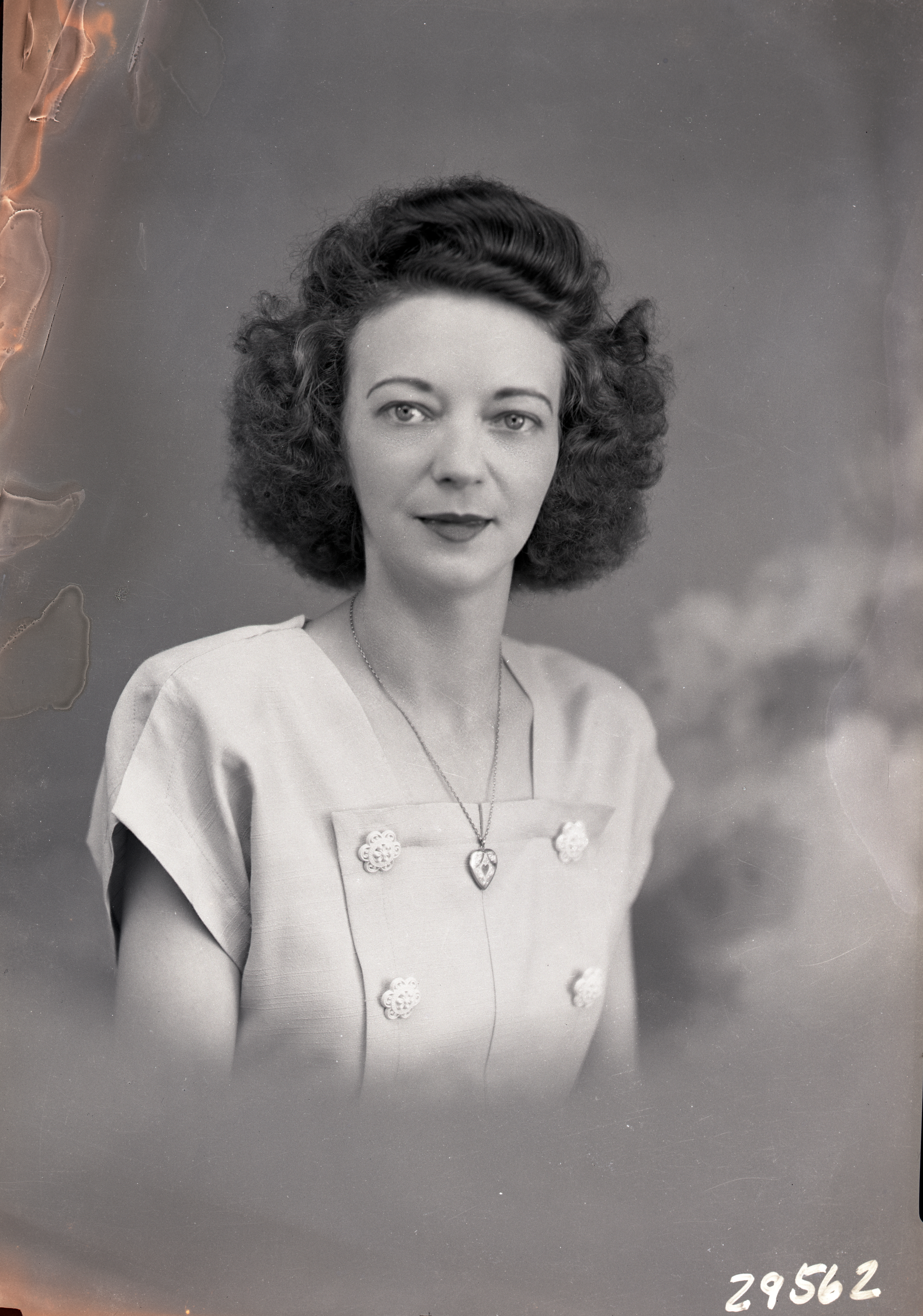 Portrait photograph of an unidentified woman with short curly hair and wearing a necklace with her short-sleeved dress.