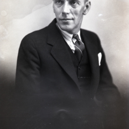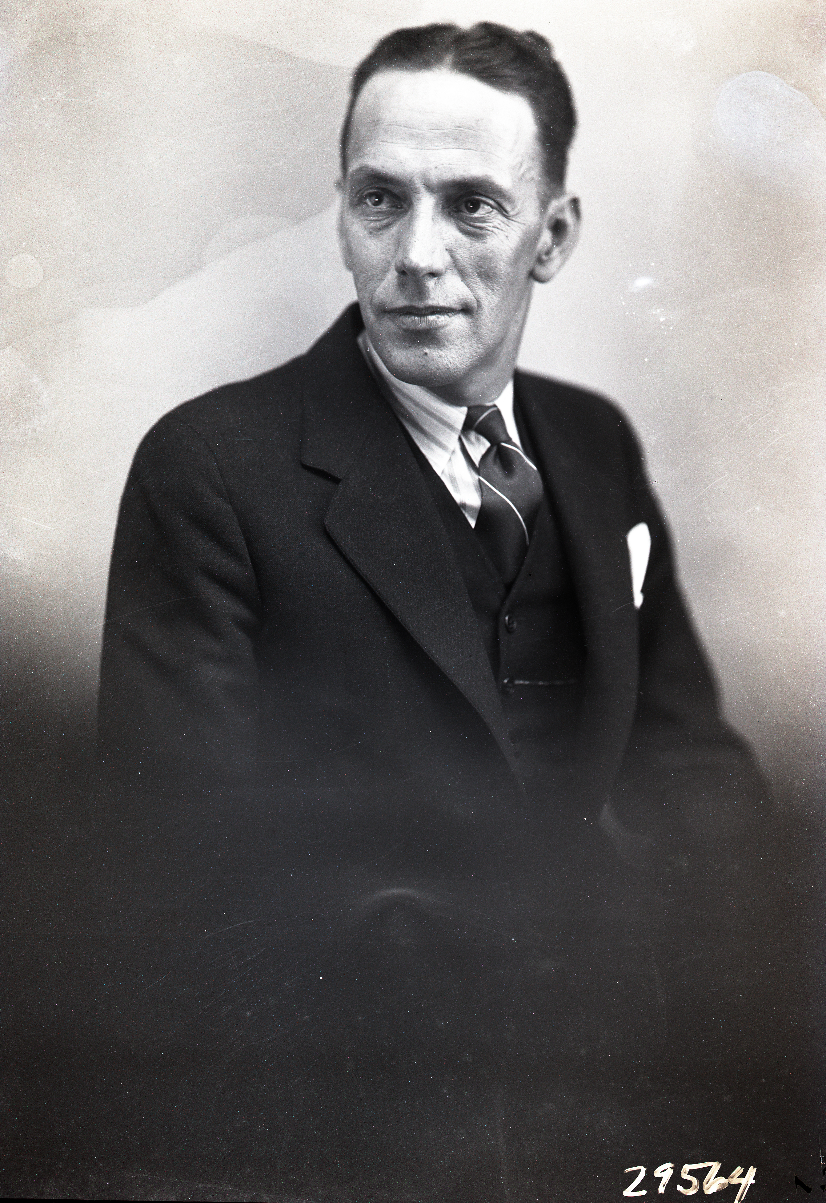 Portrait photograph of an unidentified man wearing a suit and tie with a handkerchief sticking out of his breast pocket.