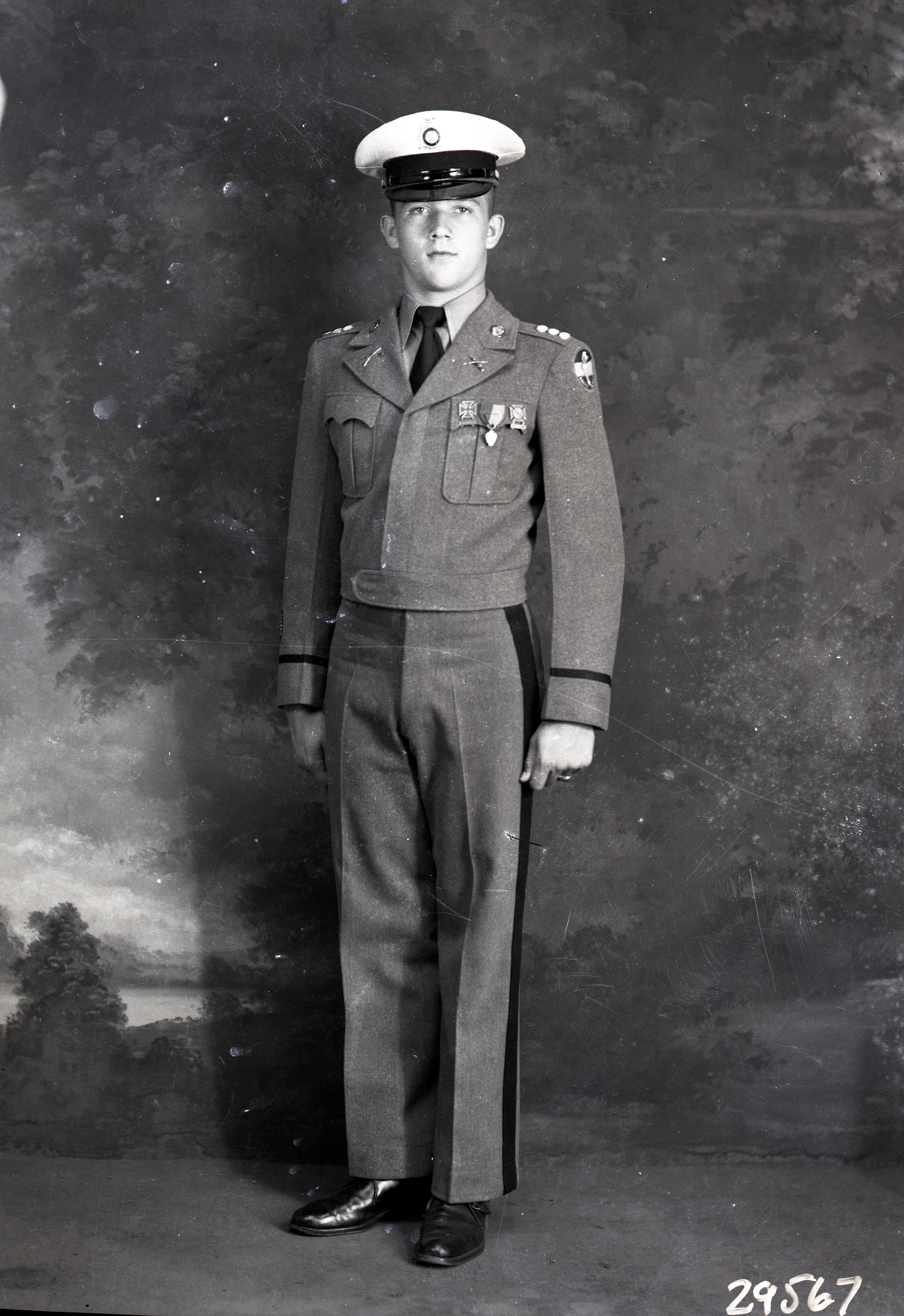 Unidentified cadet from Massanutten Military Academy (MMA) is standing in the school's uniform with a waist-length jacket, stripe down the out side of his pant legs, and a white cap.