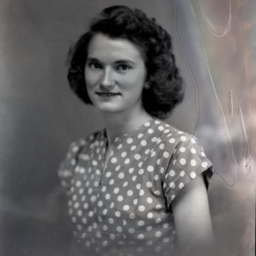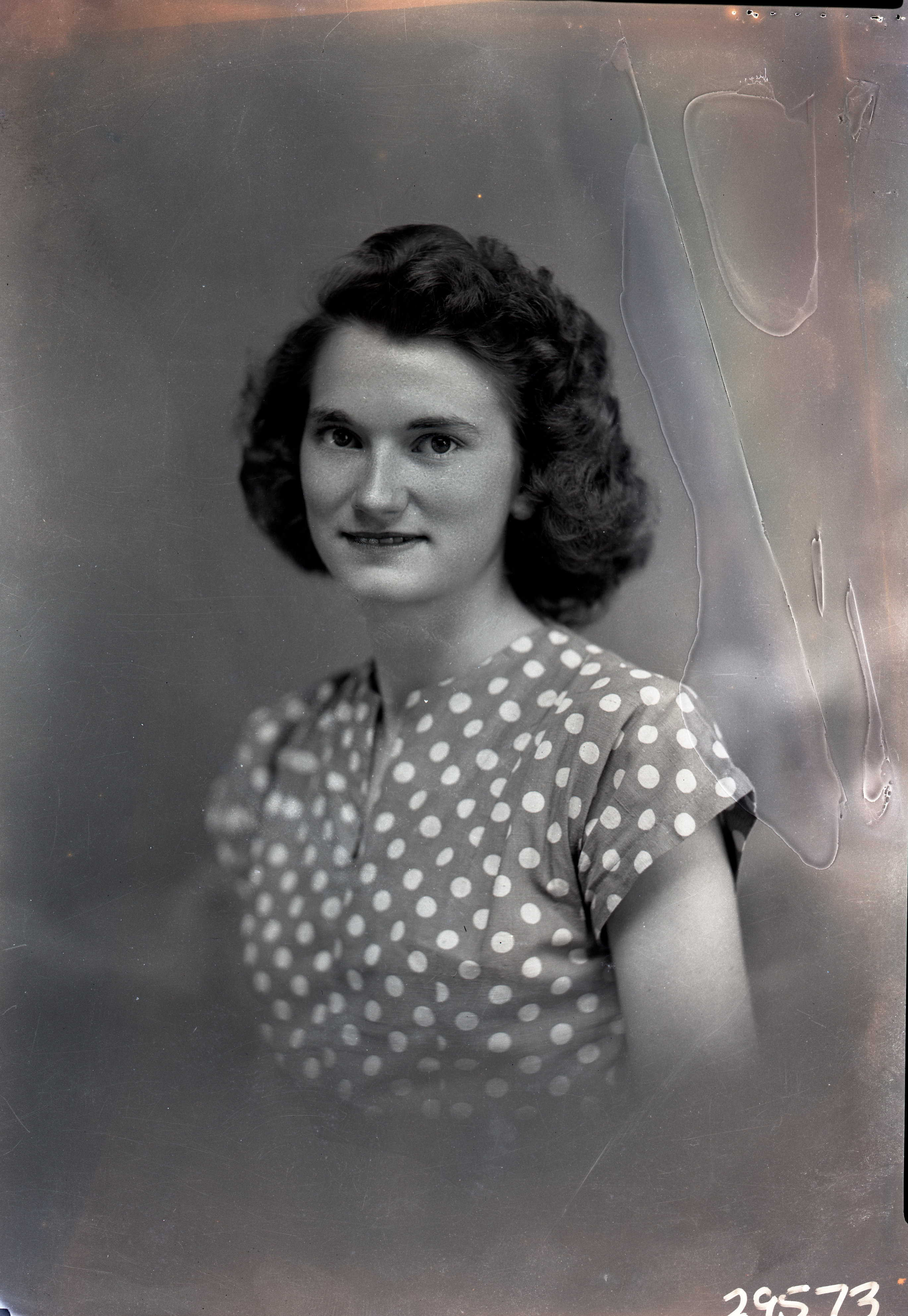 Portrait photograph of an unidentified woman with short curly, hair who is wearing a polka-dotted, short-sleeved dress.