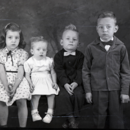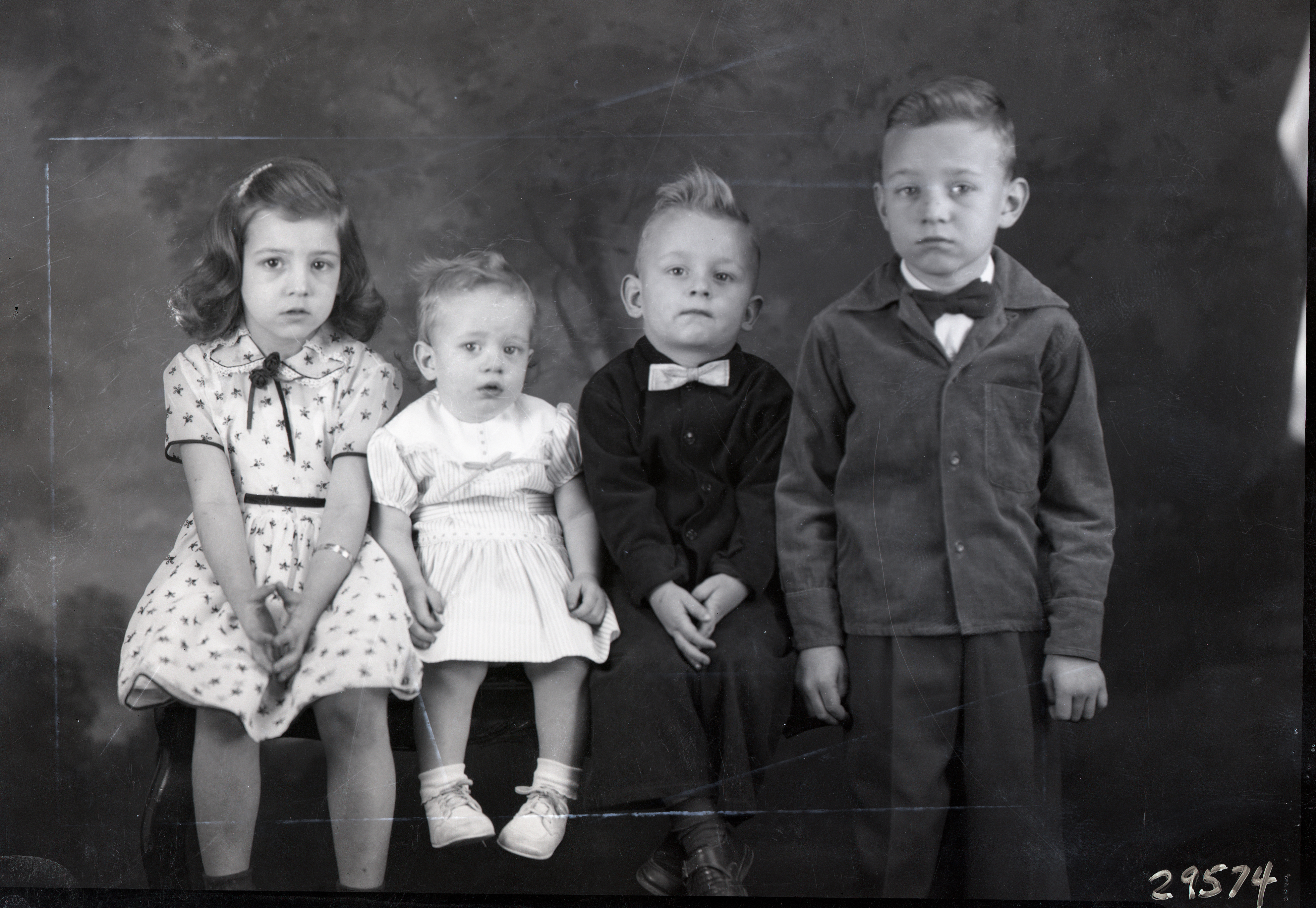 Four unidentified children of varying ages are posed together. There are two young girls on the left and two boys with bow ties on the right.