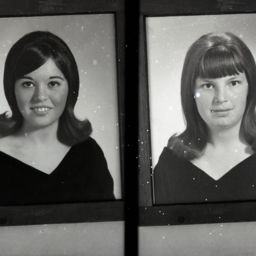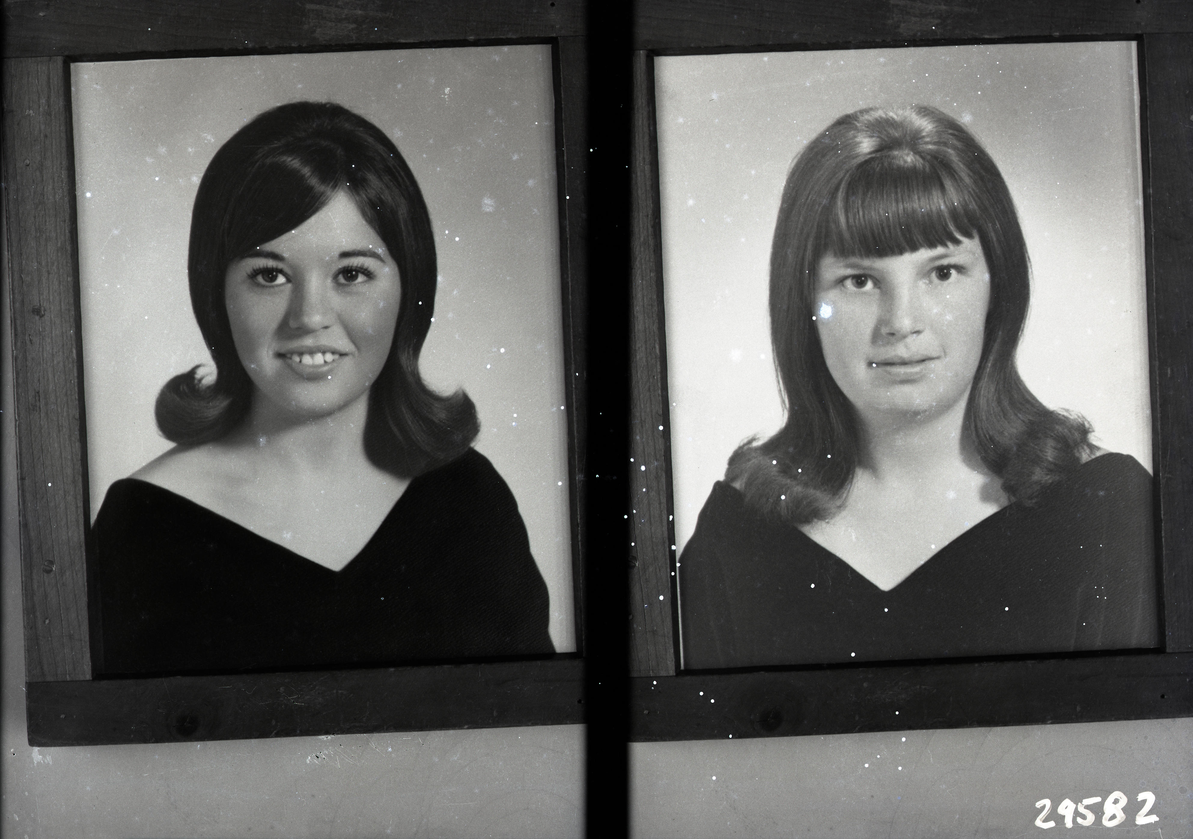 Photo of two separate portrait photographs of two unidentified young women both with shoulder-length hair and wearing a V-necked top.