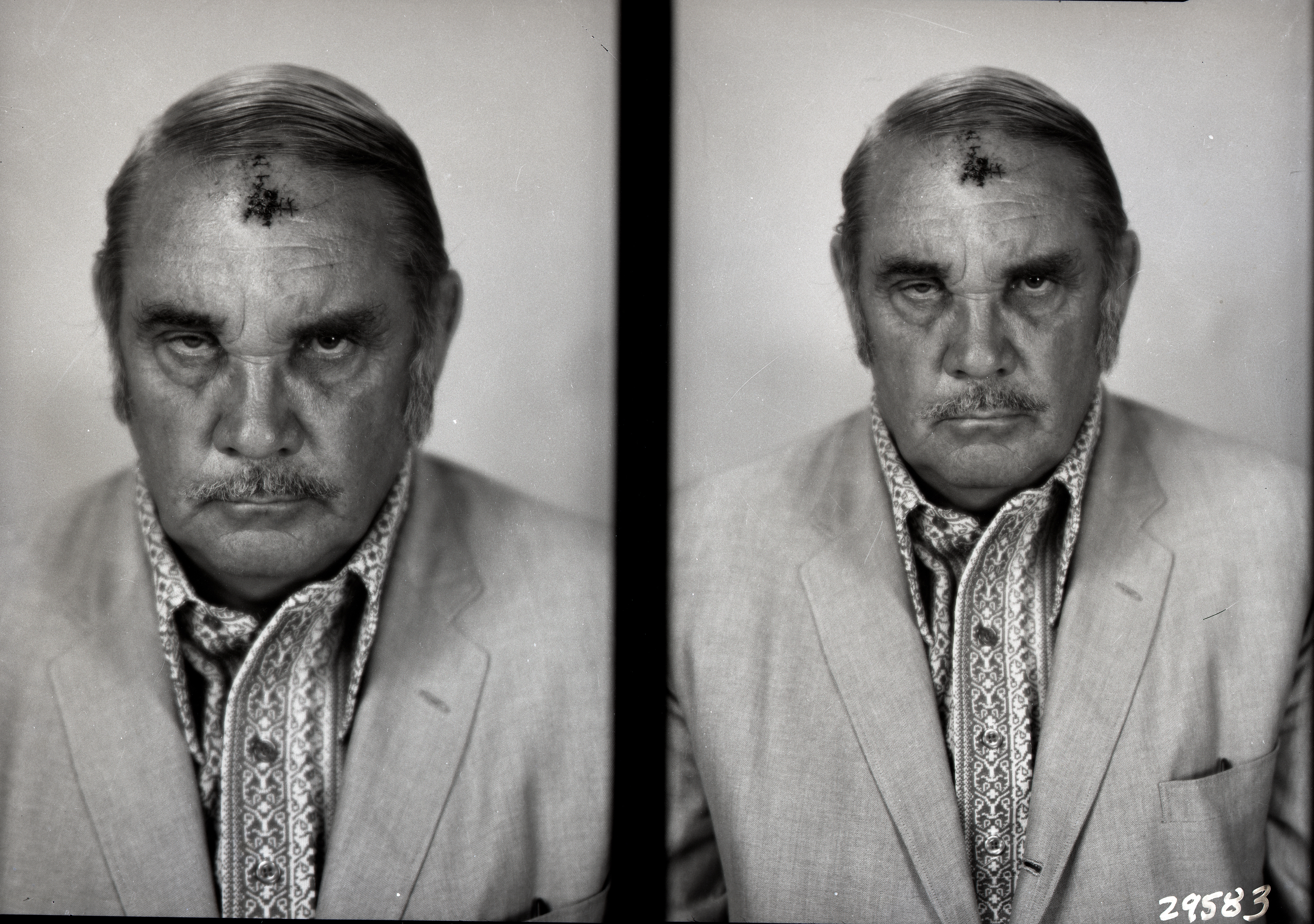 Photo of two separate portrait photograph of the same unidentified man with a bruise on his forehead.