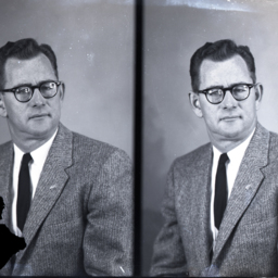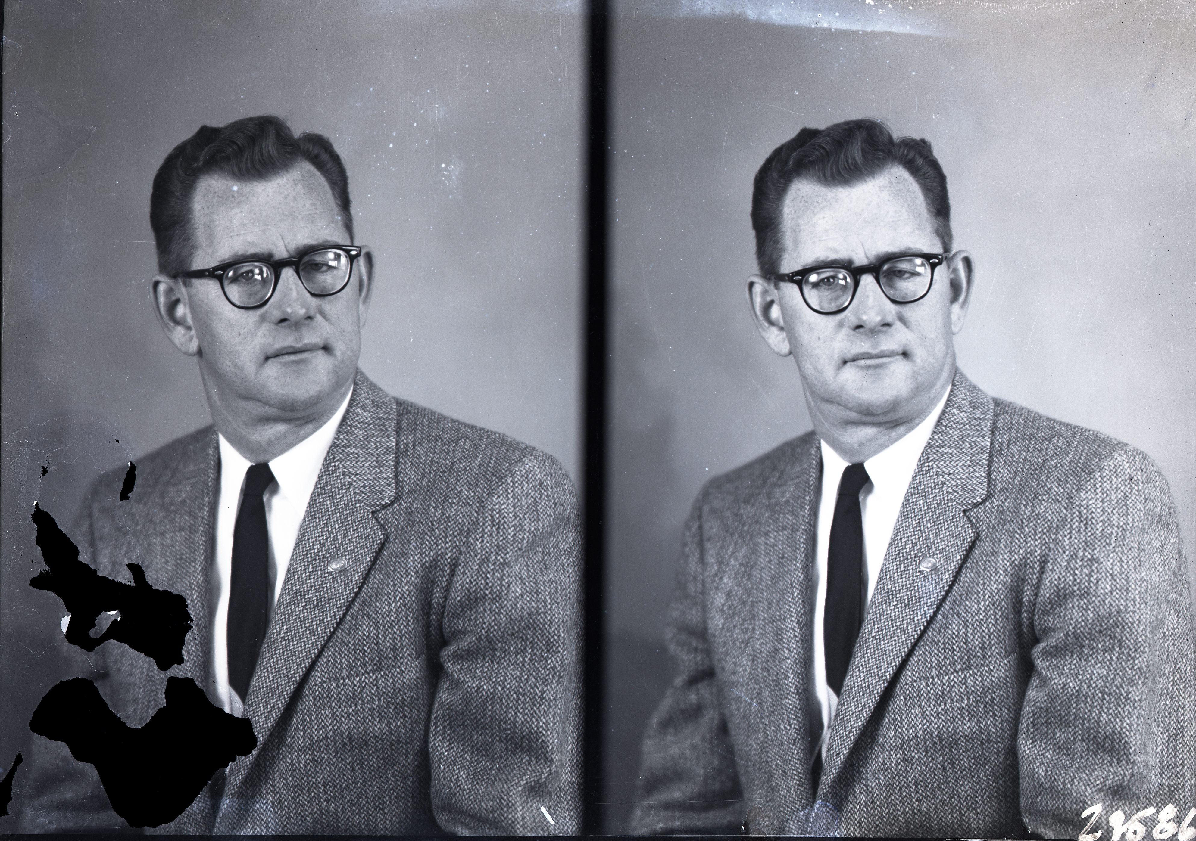 Photo of two separate portrait photographs of the same unidentified man with glasses and wearing a suit and tie.