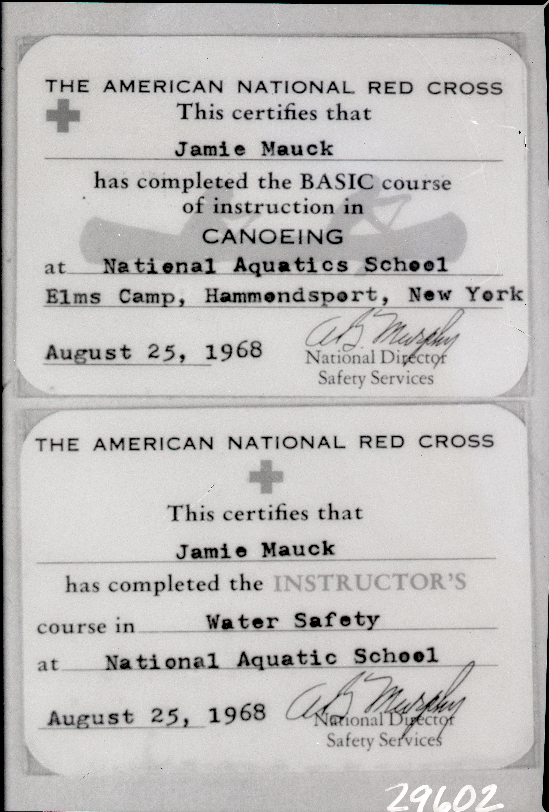 The bottom card indicates that Jamie Mauck completed the instructor's course in water safety at the same camp in New York.
