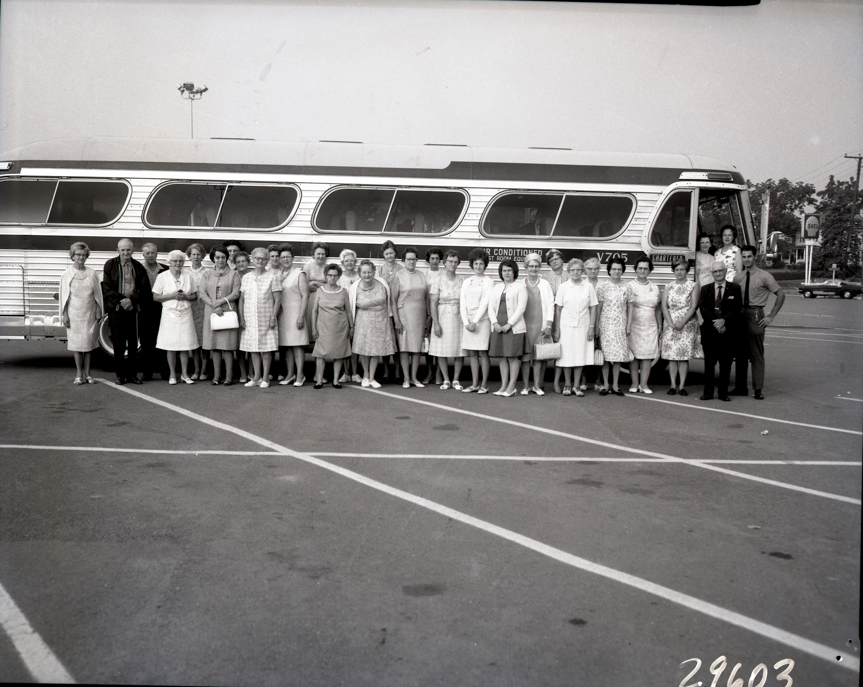 Large group of unidentified people, mostly women, are posed in front of a charter bus.