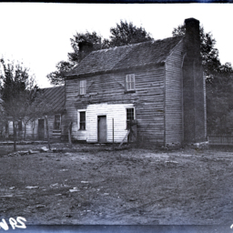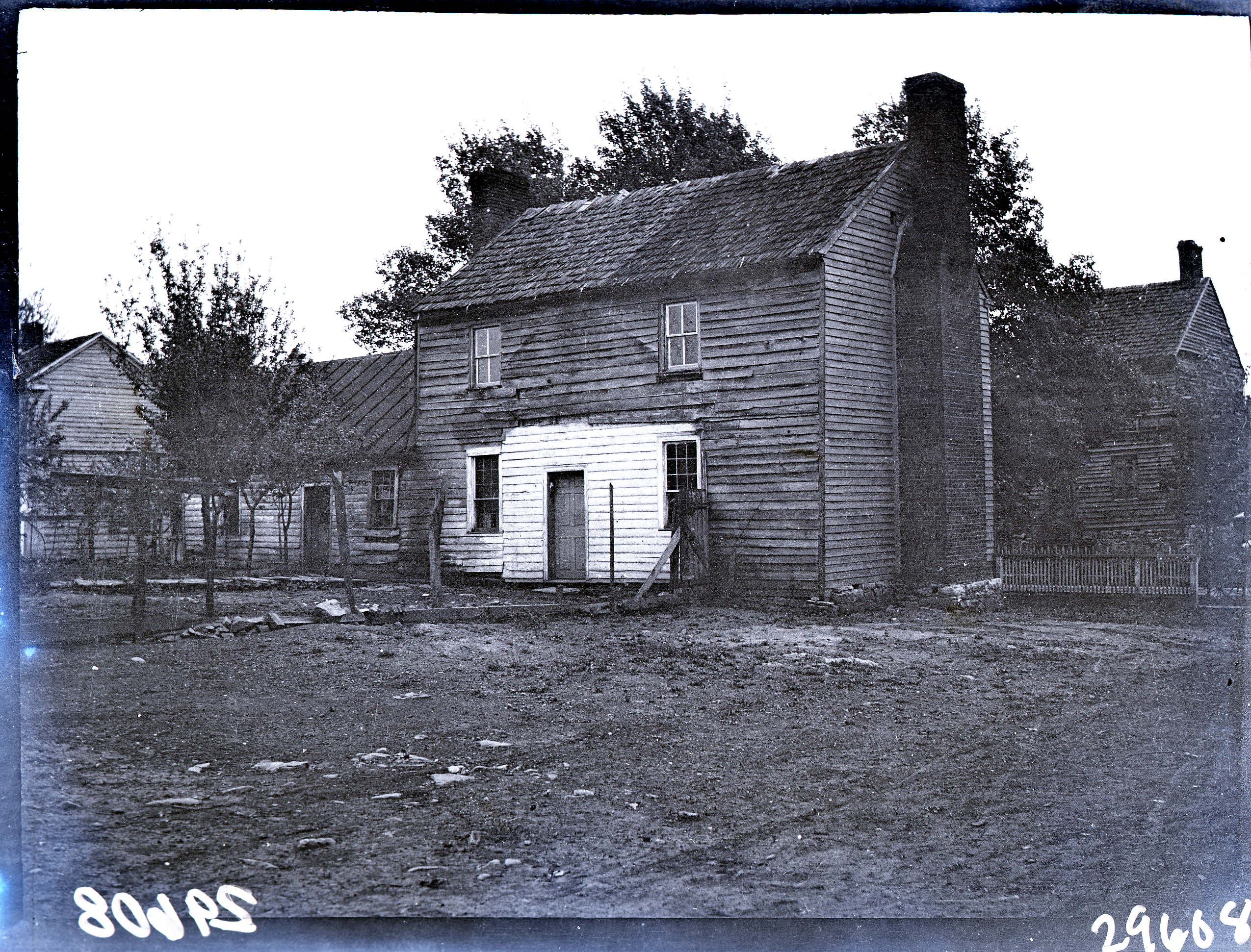 Photograph of a weathered, wood-sided, old, two story house with two chimneys and a small yard around it.