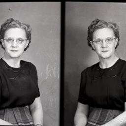 Photo of two separate portrait photographs of the same unidentified woman with short, curly hair and glasses.