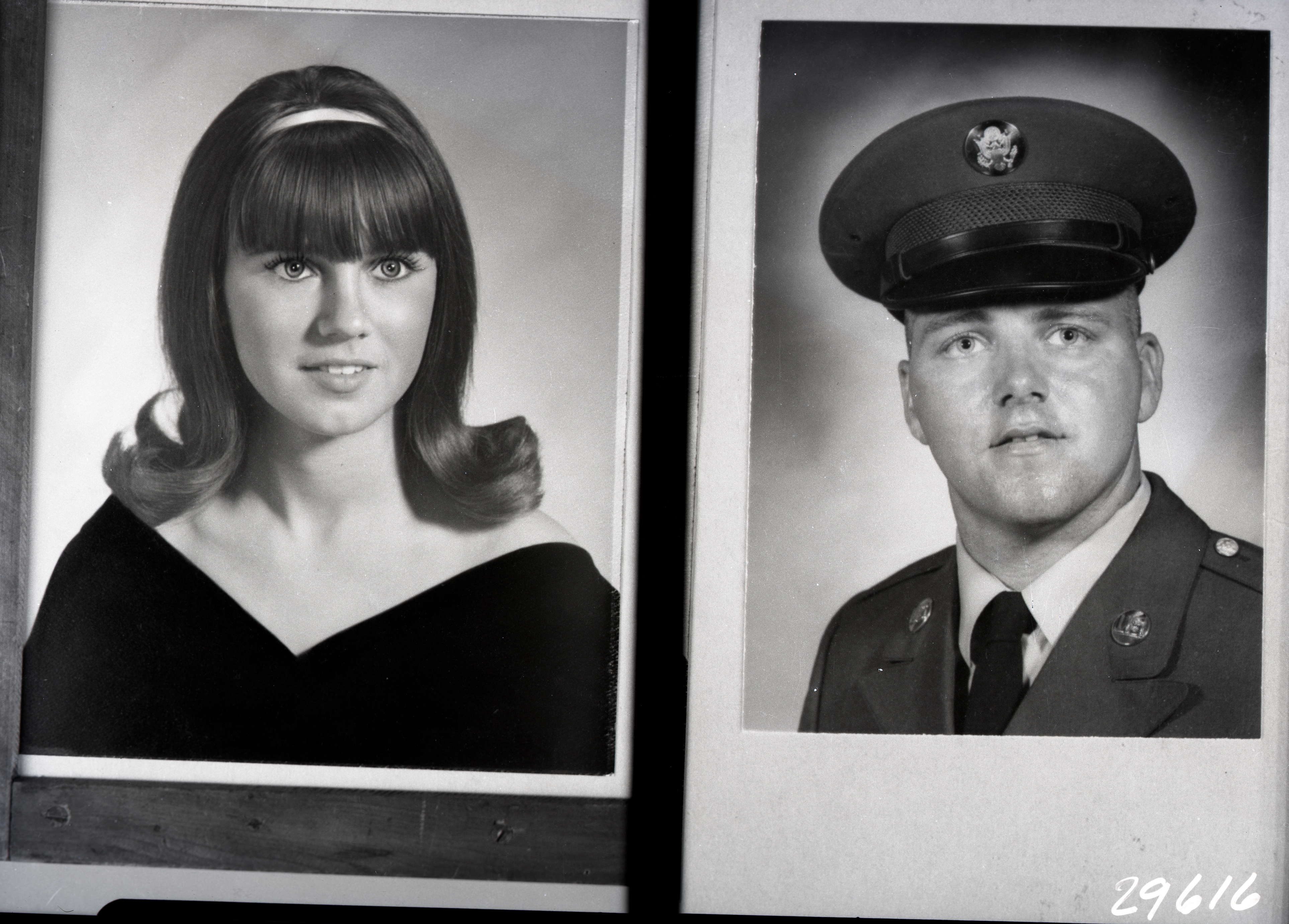 On the right is a young man wearing a U.S. Army uniform with a cap.