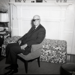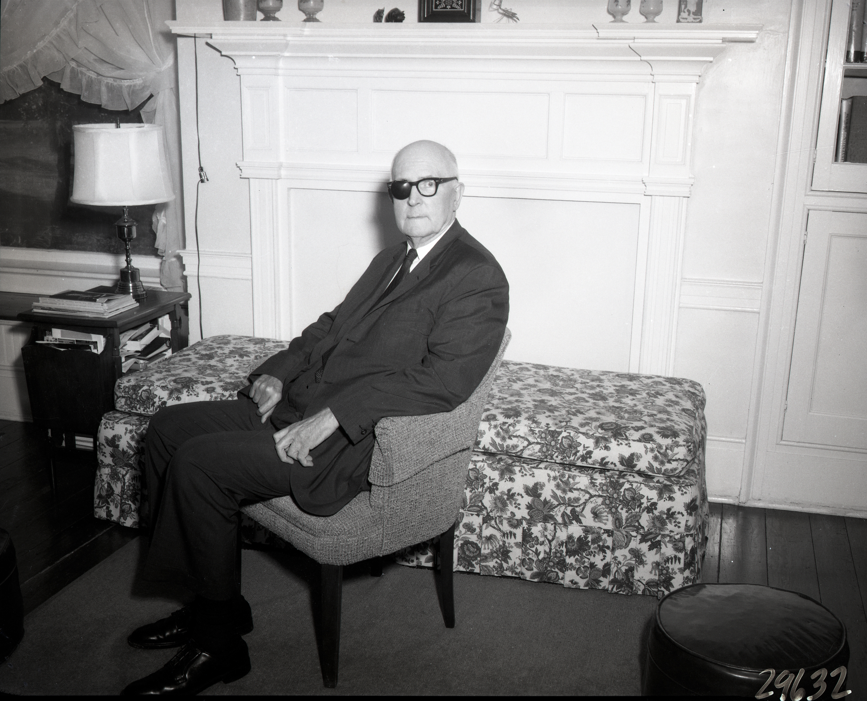 Unidentified older man wearing an eye patch is seated on an upholstered chair in front of a closed off fireplace.