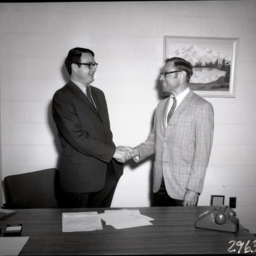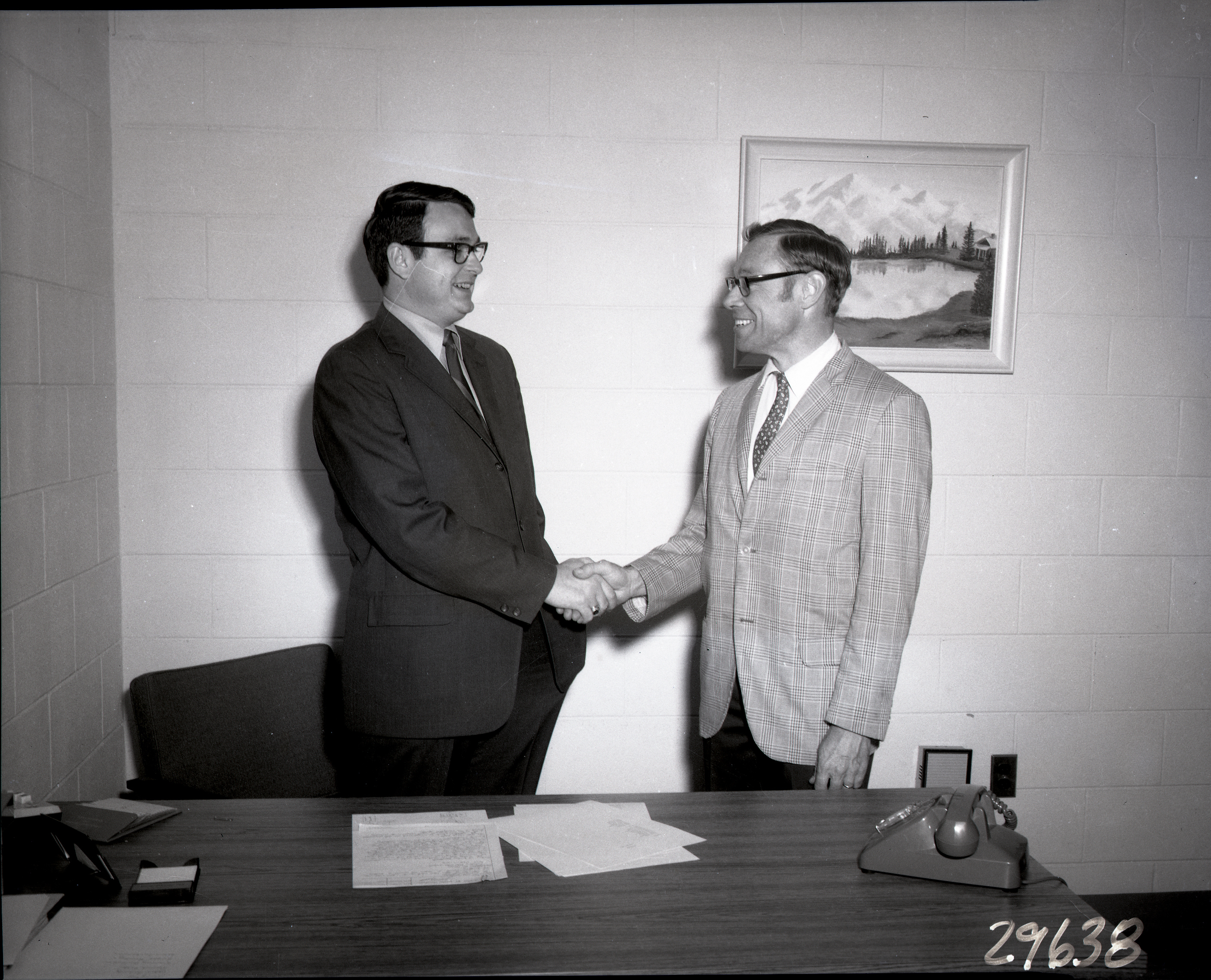 Two unidentified men, both with glasses and wearing suits, are pictured behind a desk in an office where they are shaking hands.