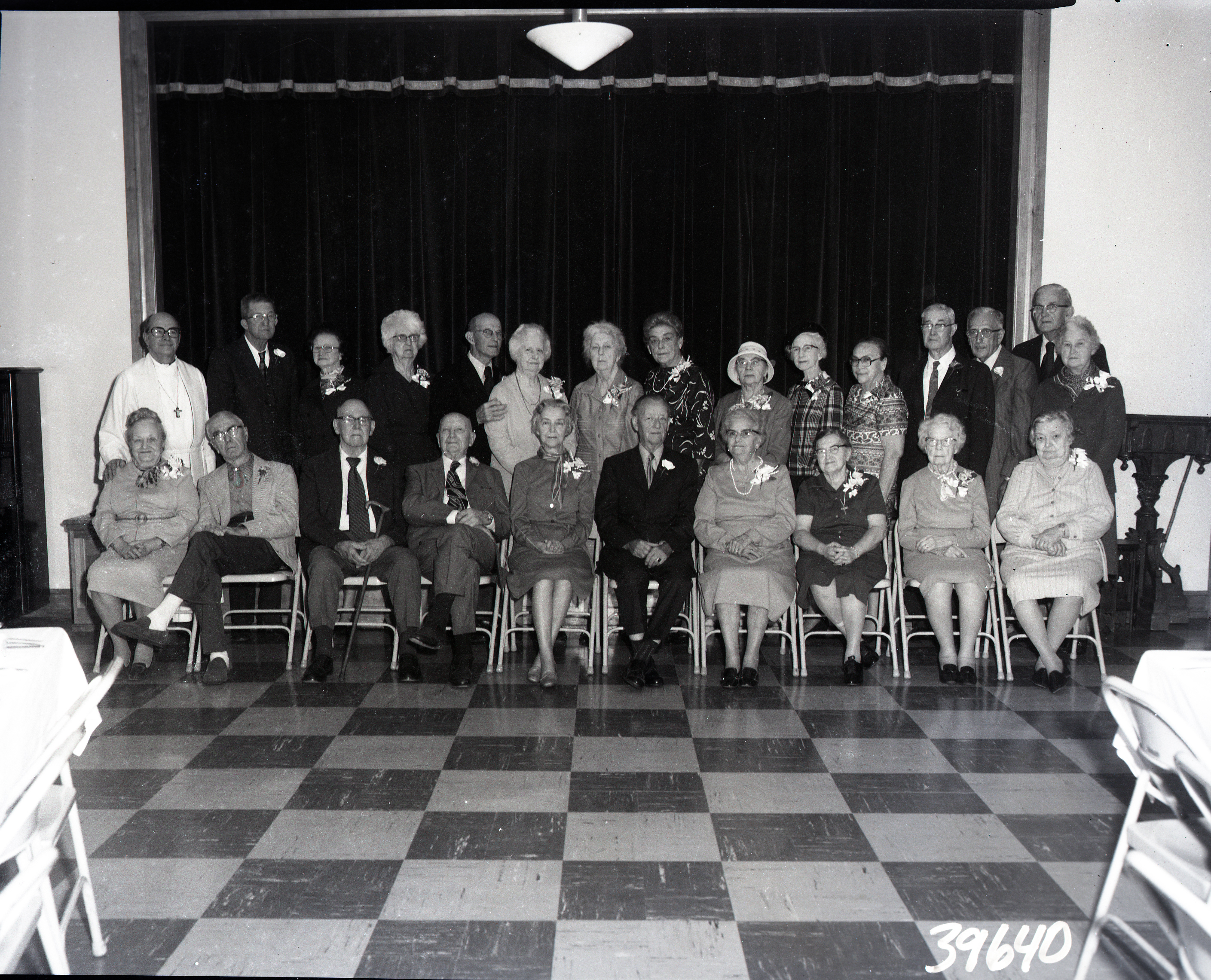 Unidentified group of older men and women are posed together in the community room of Emanuel Lutheran Church in Woodstock.