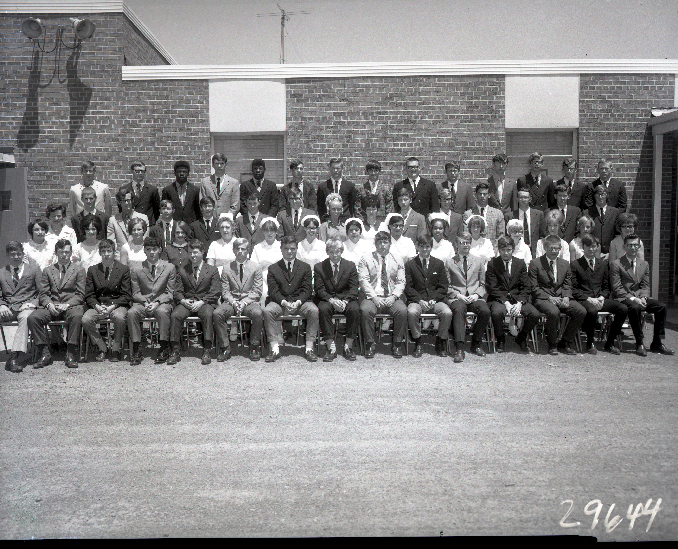 Large group of young men and women, probably high school students, are posed together in rows outdoors.