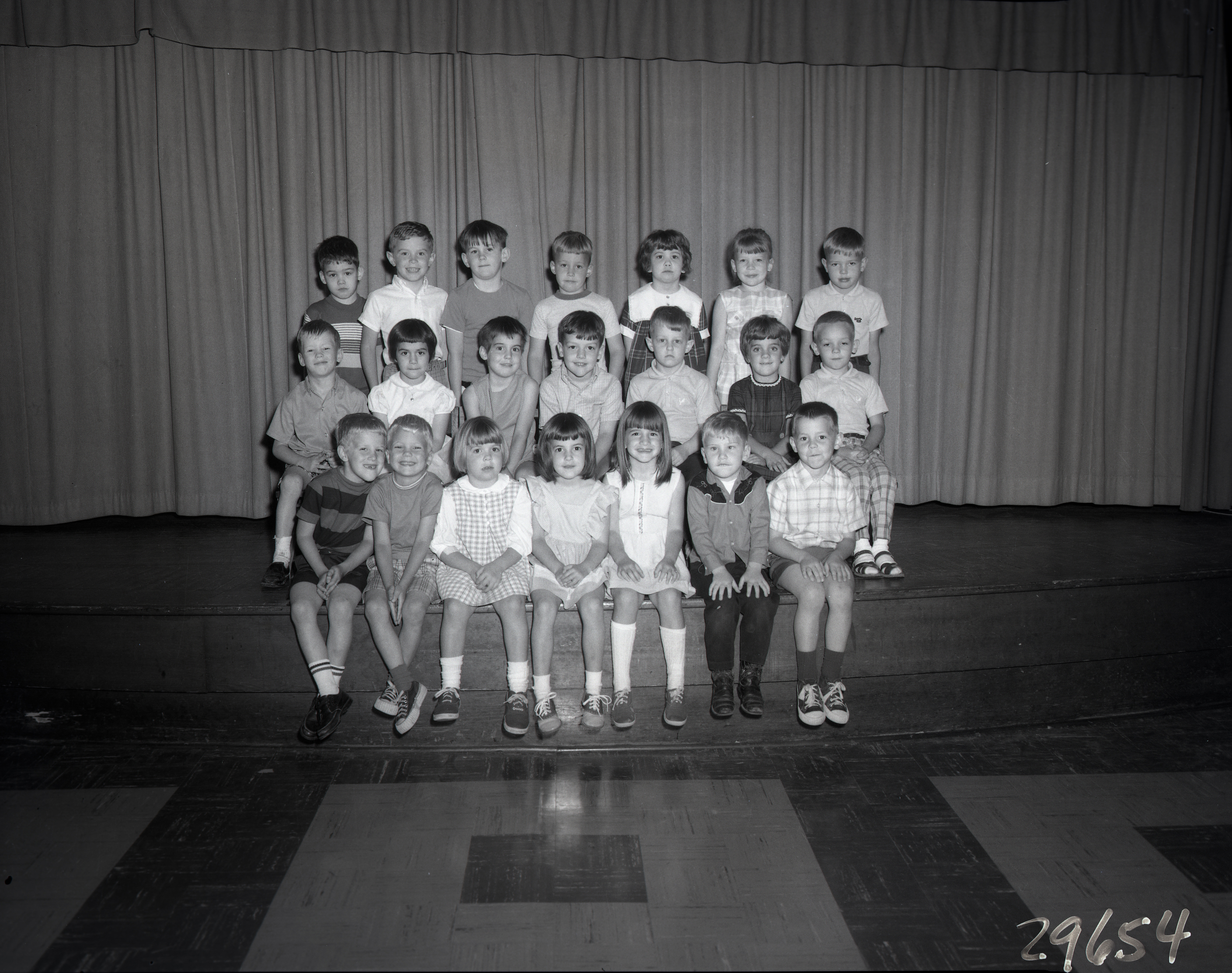 Group of unidentified elementary school-aged children posed together in rows on the edge of a stage.