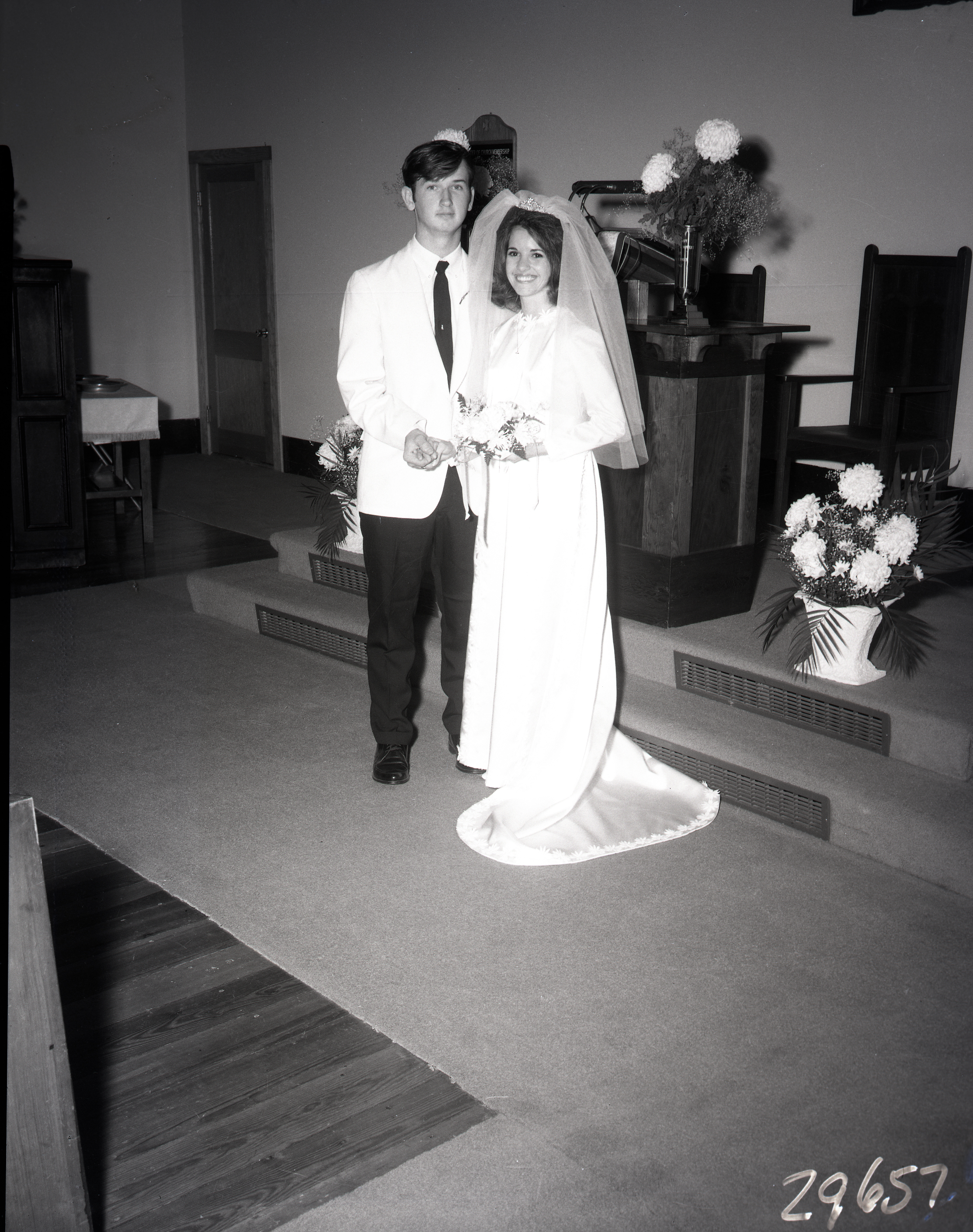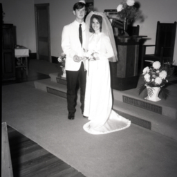 Photograph of an unidentified bride and groom standing together in their wedding attire.
