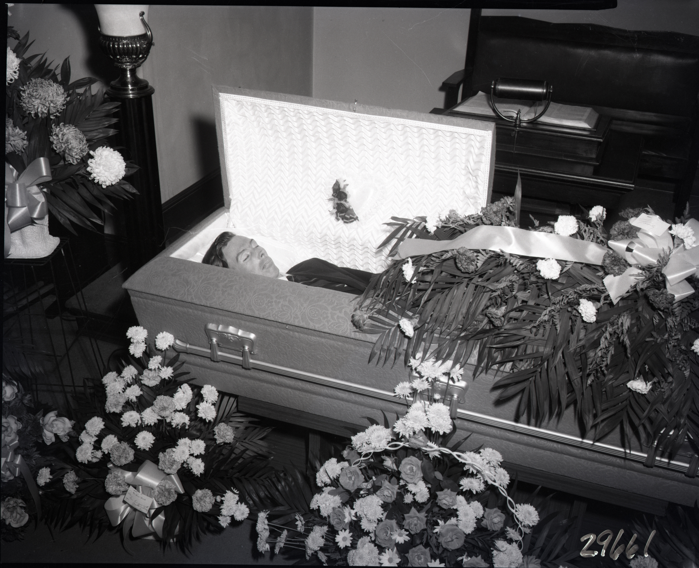 Unidentified dead man is lying in a satin-lined casket surrounded by flower arrangements.
