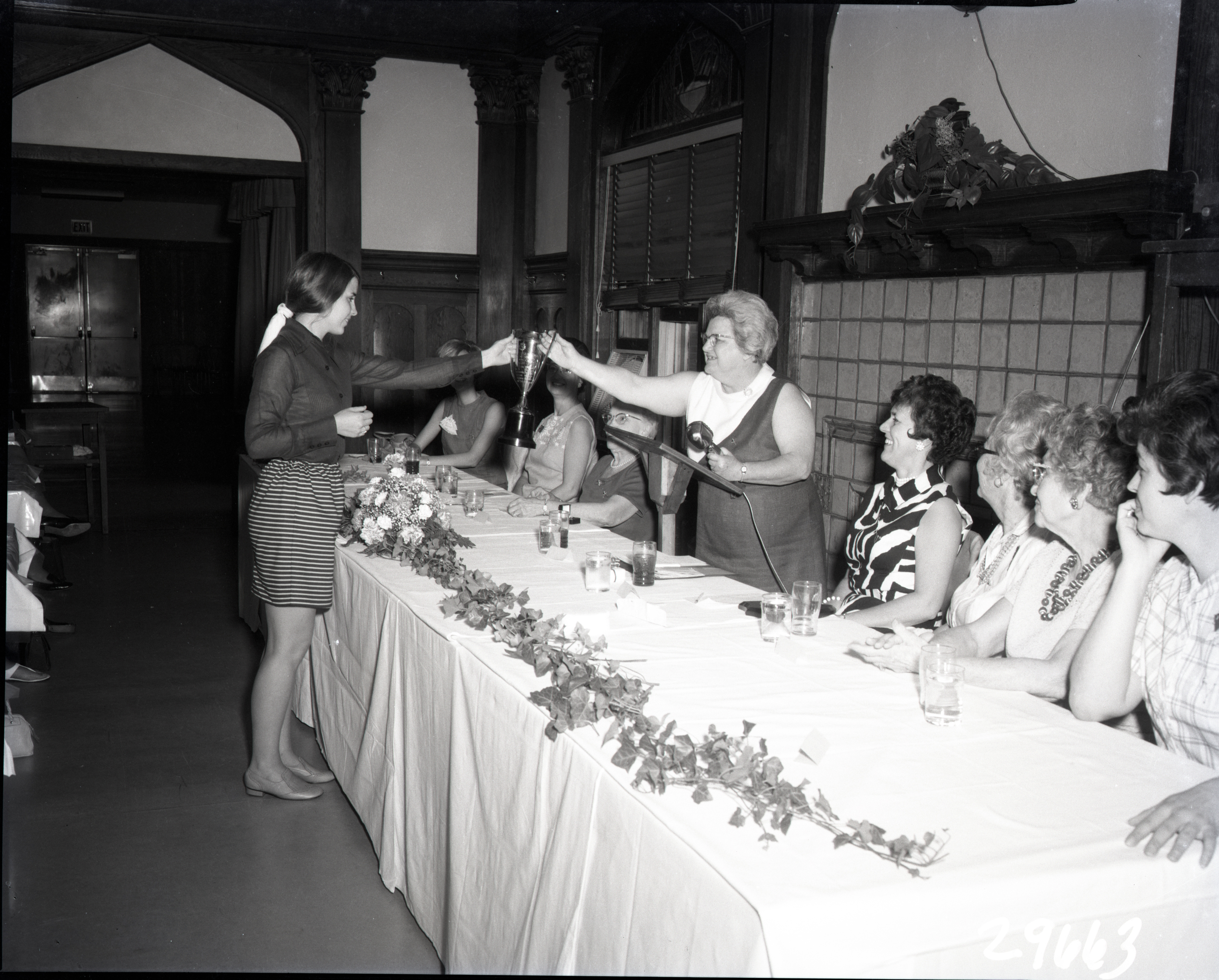 One woman is standing with a microphone in one hand and a trophy cup in the other. She is handing the cup to an unidentified younger woman who is standing on the other side of the table.