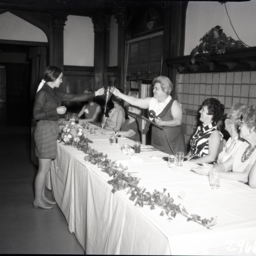 Unidentified women seated along one side of a banquet table.