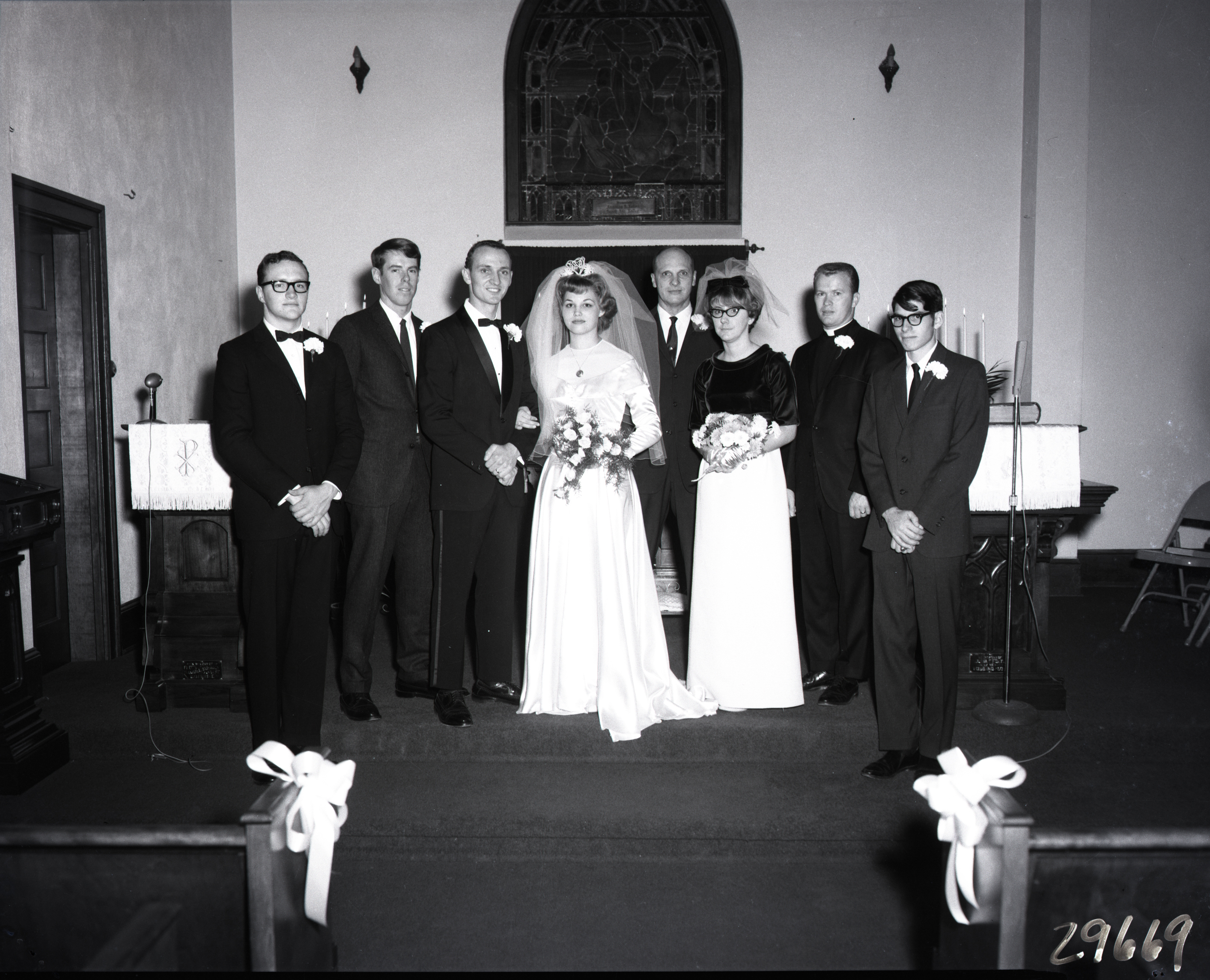 Unidentified members of a wedding party and the minister are posed with the bride and groom on the altar of a church.