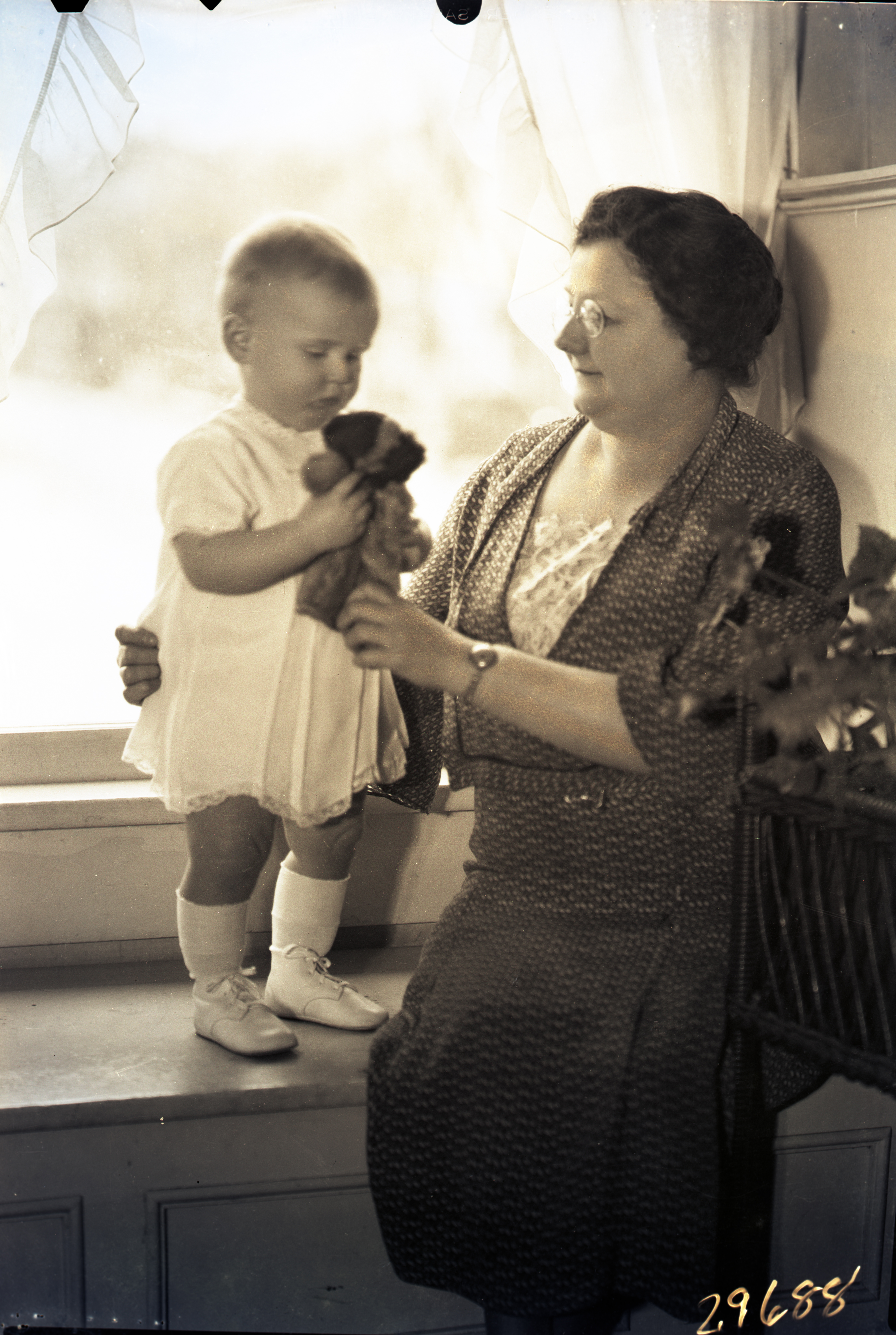 Unidentified woman is sitting beside a standing toddler. They are both in front of a window.