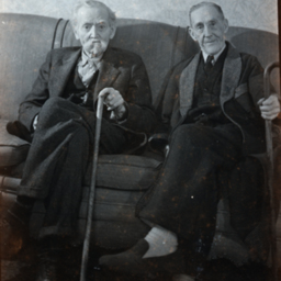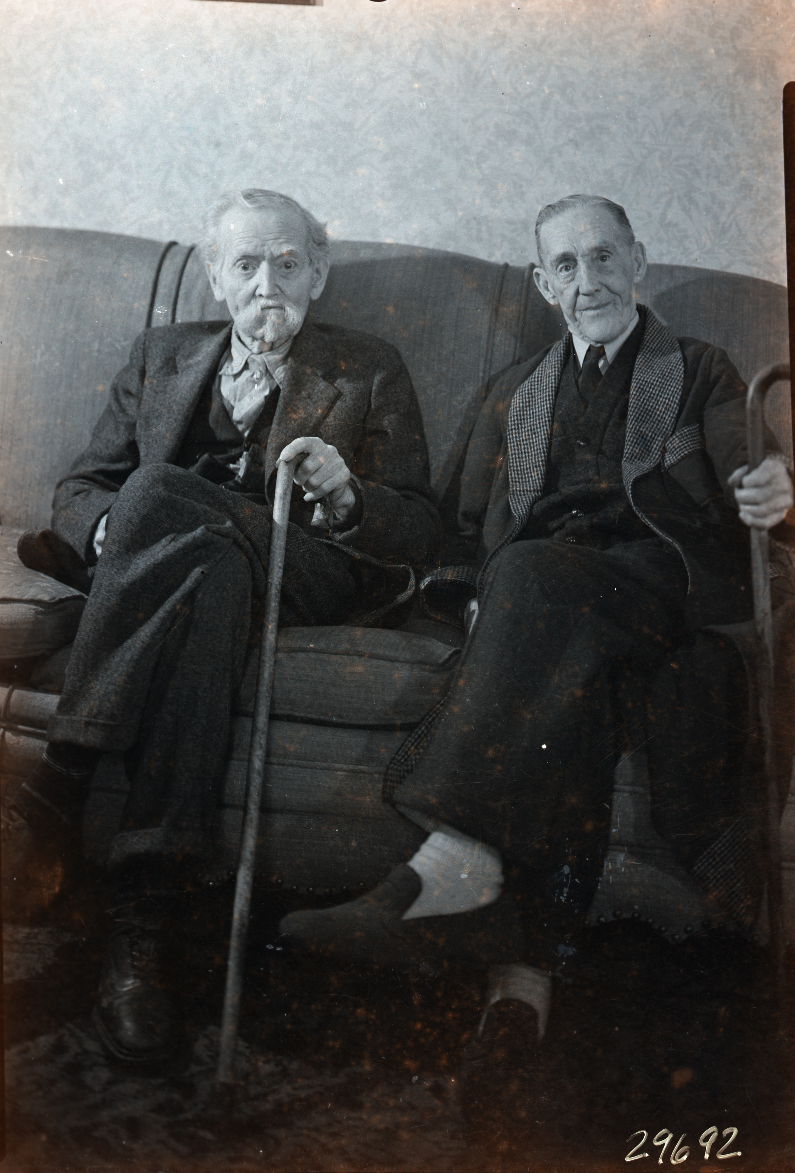 Two unidentified older men are sitting on a couch together, both holding canes.