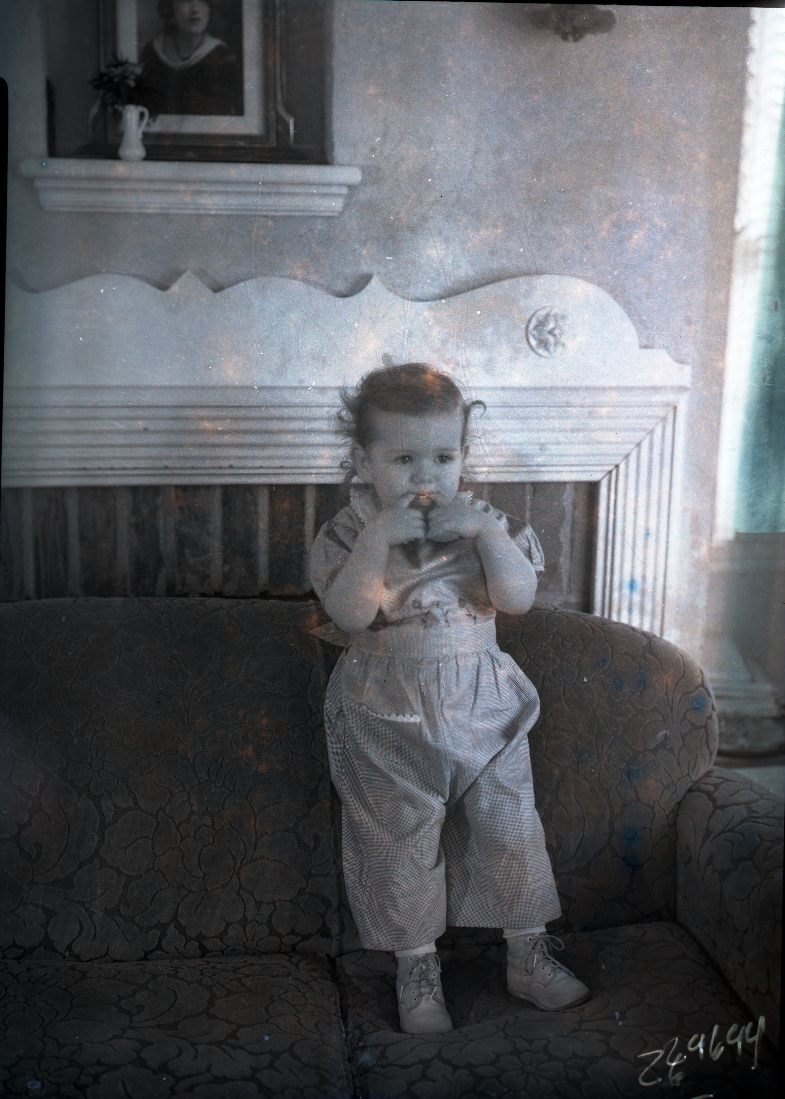 Unidentified young child is standing on a couch with a finger from each hand in her mouth.