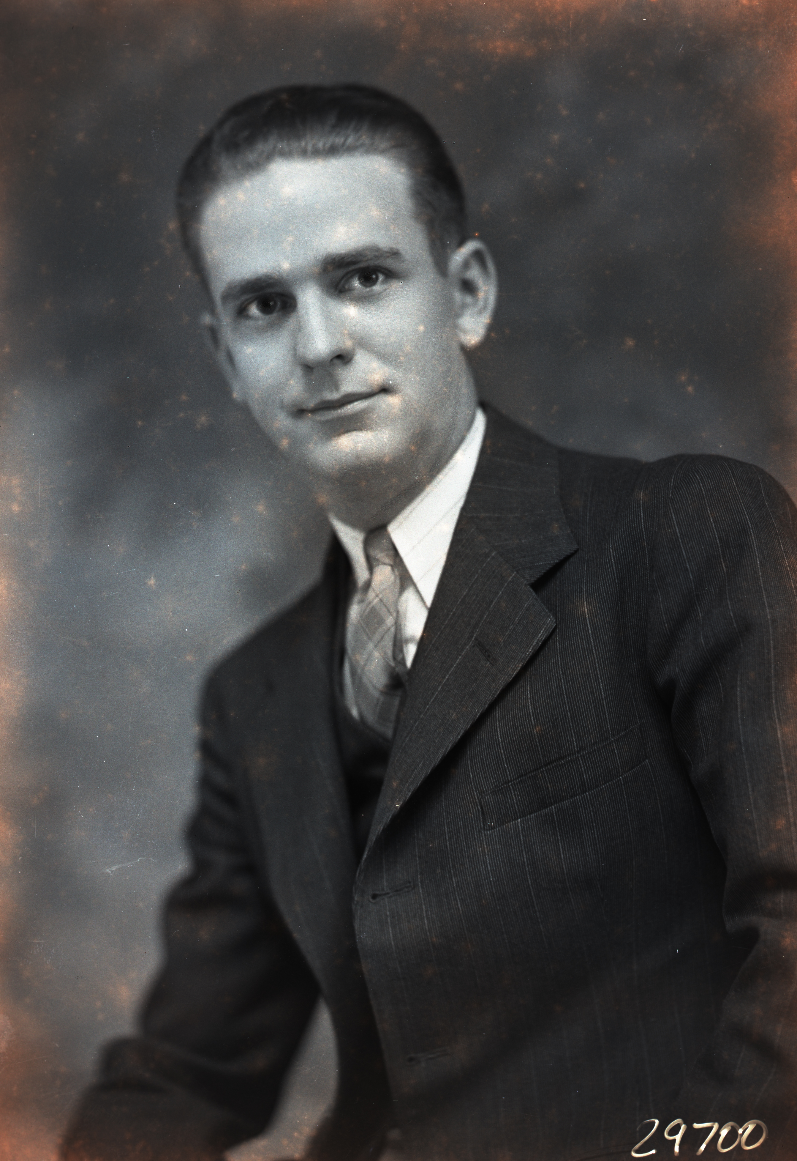 Portrait photograph of an unidentified young man wearing a suit and tie.