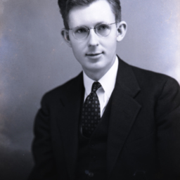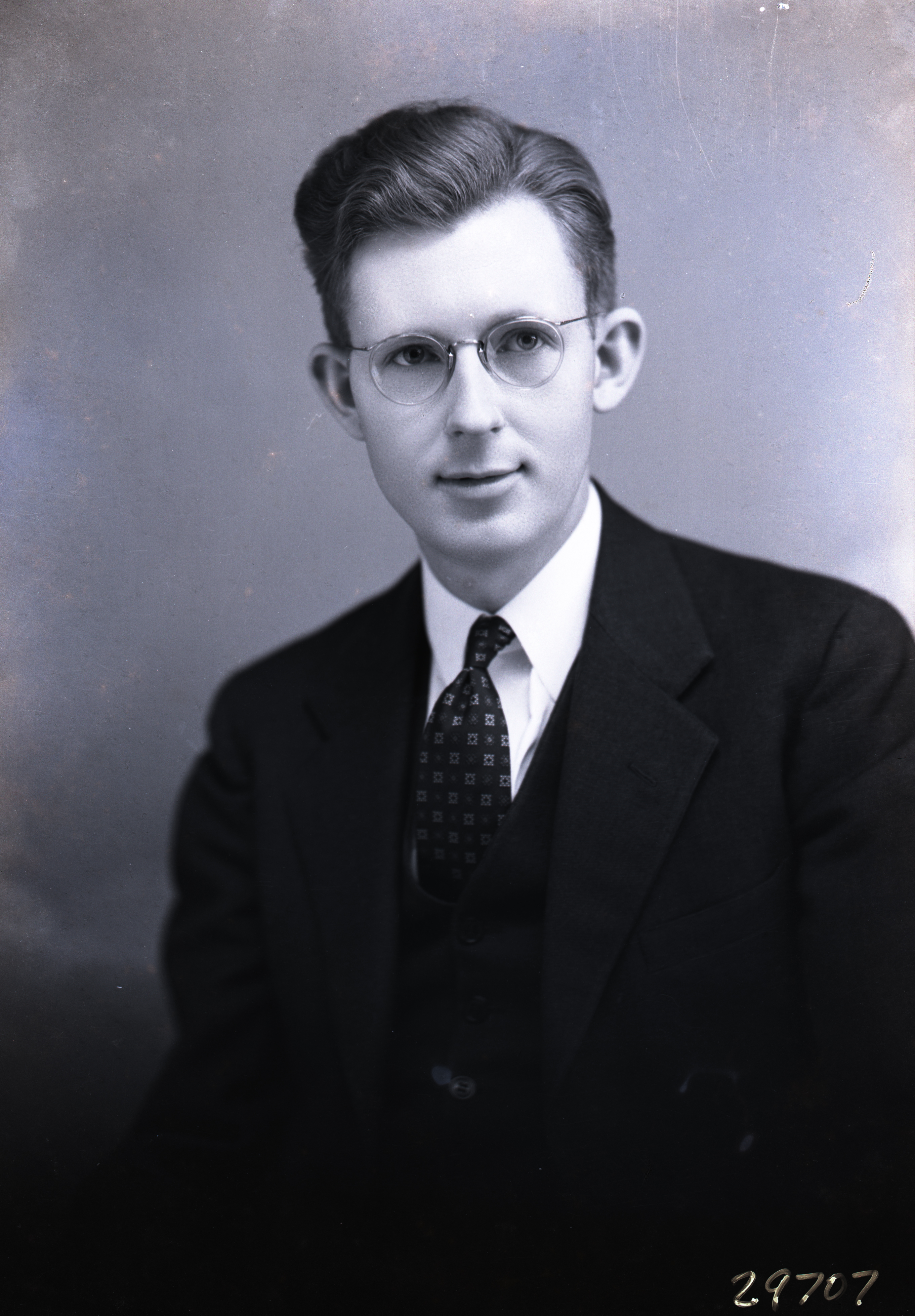 Portrait photograph of an unidentified young man with glasses and wearing a suit and tie.