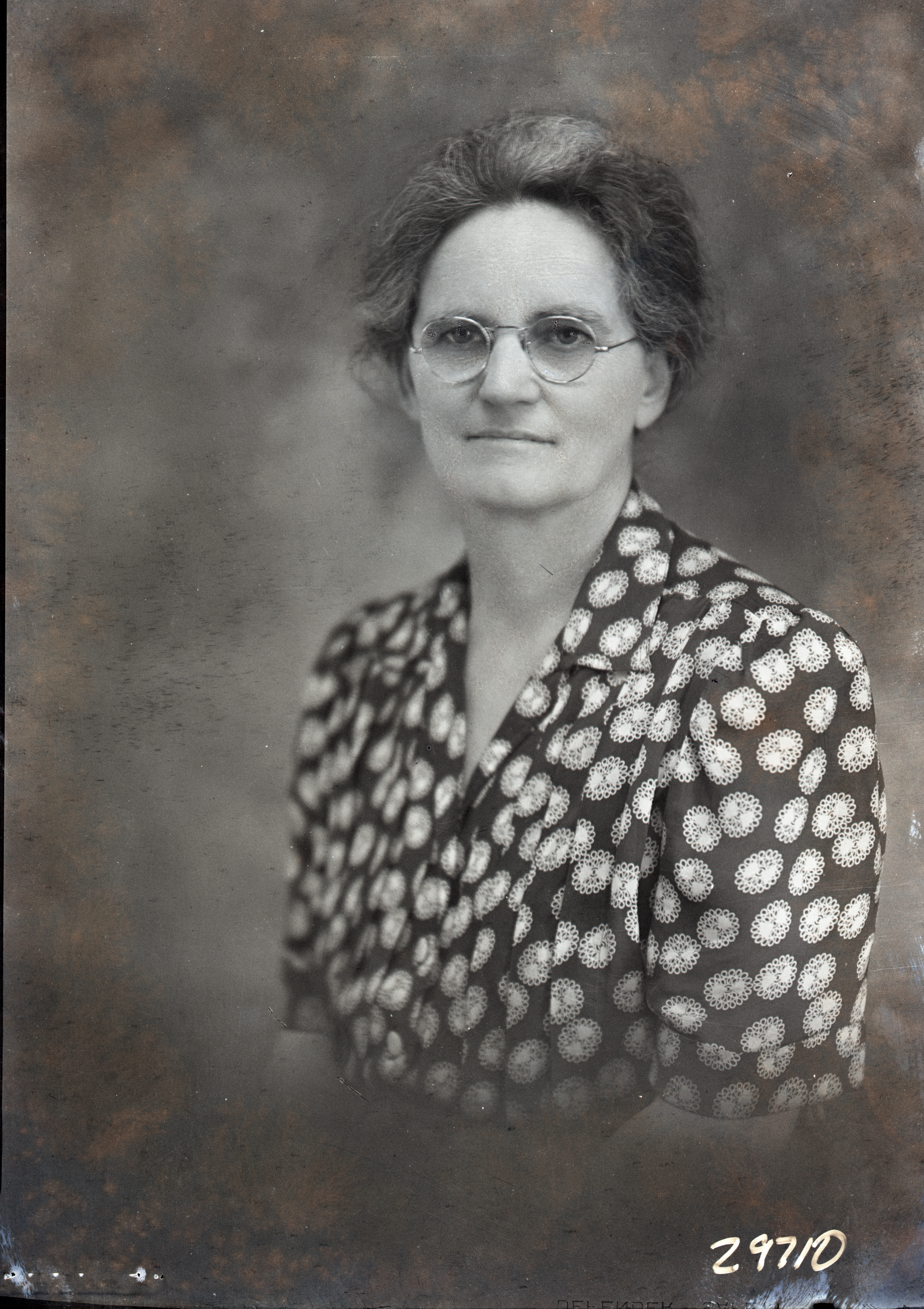 Portrait photograph of an unidentified woman with glass and her hair pulled back, is wearing a short-sleeved, print dress.
